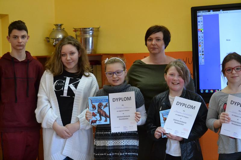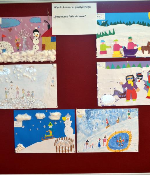 W poniedziałek, 26 lutego, nastąpiło oficjalne już zakończenie Szkolnego Konkursu Plastycznego „Bezpieczne Ferie Zimowe”. W tym dniu swoje nagrody, ufundowane przez sklepik szkolny, otrzymały dzieci z klas 1-3 SP, natomiast tydzień wcześniej z wyróżnień mieli okazję ucieszyć się uczniowie klas 4-7 SP. Komisja łącznie oceniła 70 prac, z czego aż 64 wykonały nasze szkolne „maluchy” – i to właśnie spośród nich wyłoniono zwycięzców. Z uwagi na znikome zainteresowanie konkursem uczniów starszych, zdecydowano o przyznaniu im wyróżnień bez wyłaniania laureatów.