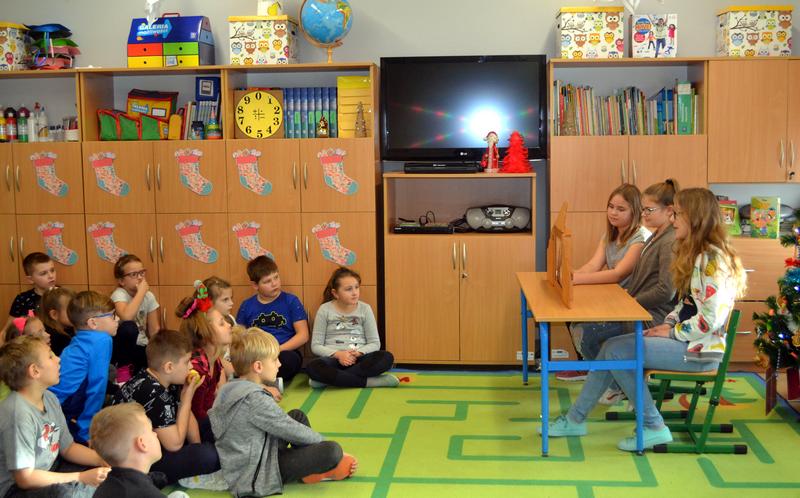 Uczennice z Vb zaprezentowały dzieciom teatrzyk „Lew w Paryżu” za pomocą japońskiej metody zwanej Kamishibai (Kami – papier, Shibai – sztuka).