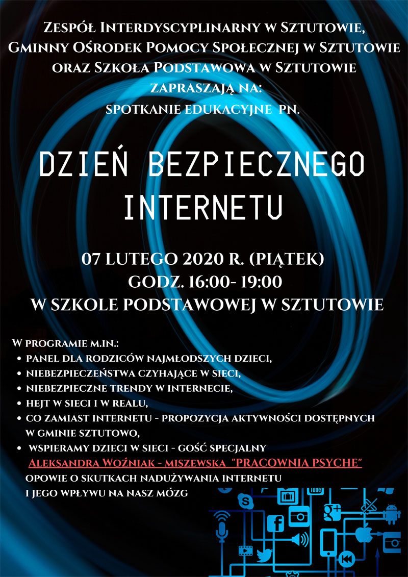 7 lutego, w piątek od 16.00 do 19.00 Zespół Interdyscyplinarny we współpracy z GOPSem i szkołą organizuje działania w ramach Dnia Bezpiecznego Internetu.