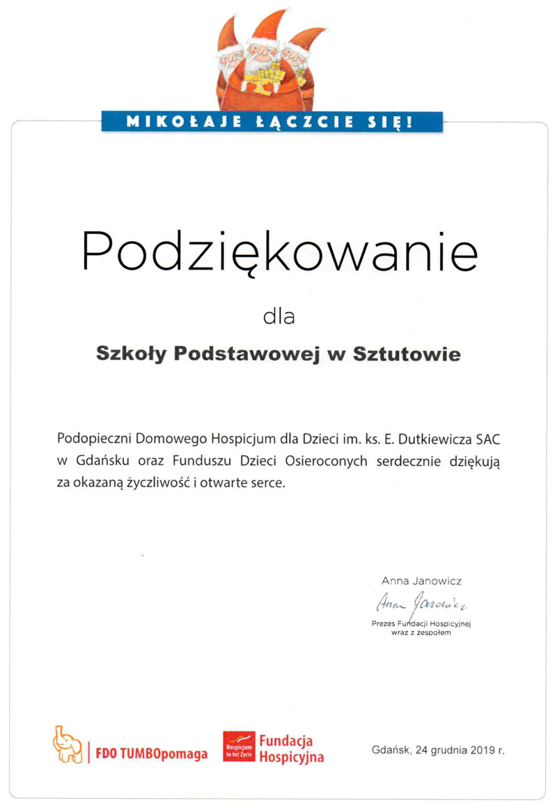 Szkoła w Sztutowie jak zawsze pomagała podopiecznym Domowego Hospicjum dla Dzieci im. Ks. E. Dutkiewicza SAC w Gdańsku.