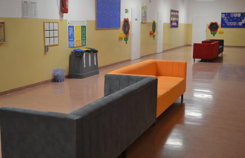 W korytarzu dla klas I-III zainstalowano zabawki edukacyjne, nowe kanapy, tablice do pisania.