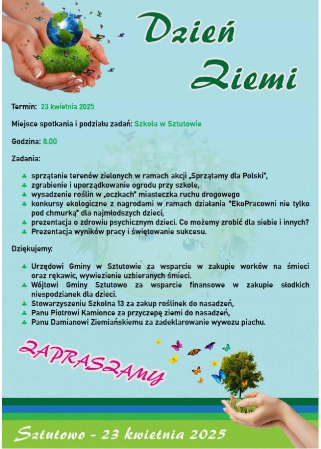 23 kwietnia 2025 roku Szkoła w Sztutowie dołącza do obchodów Dnia Ziemi oraz akcji Sprzątamy dla Polski.