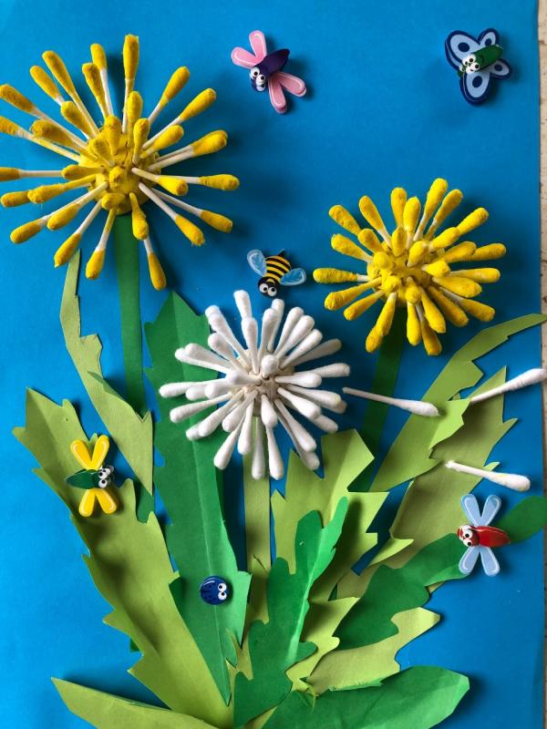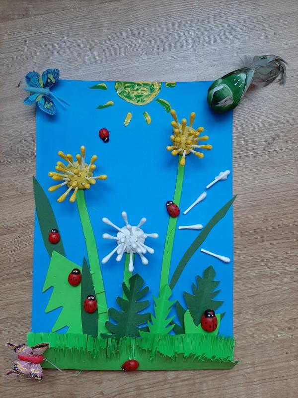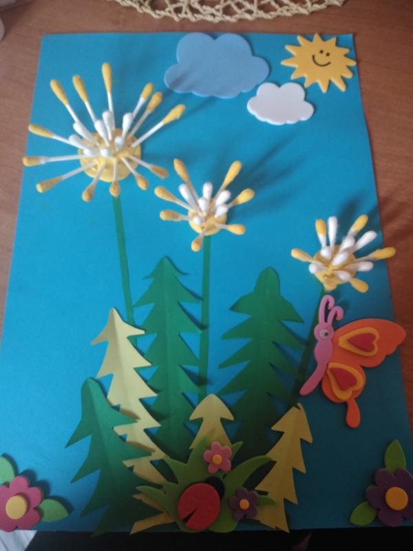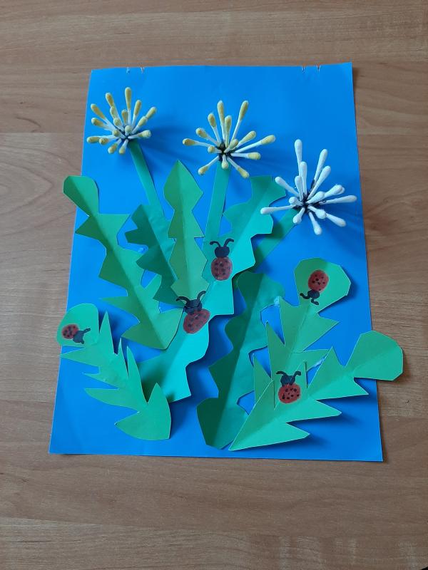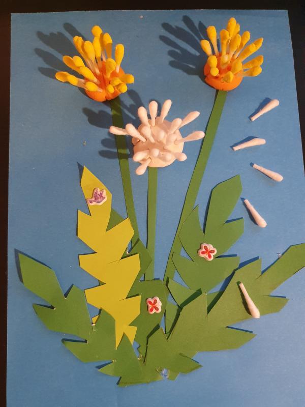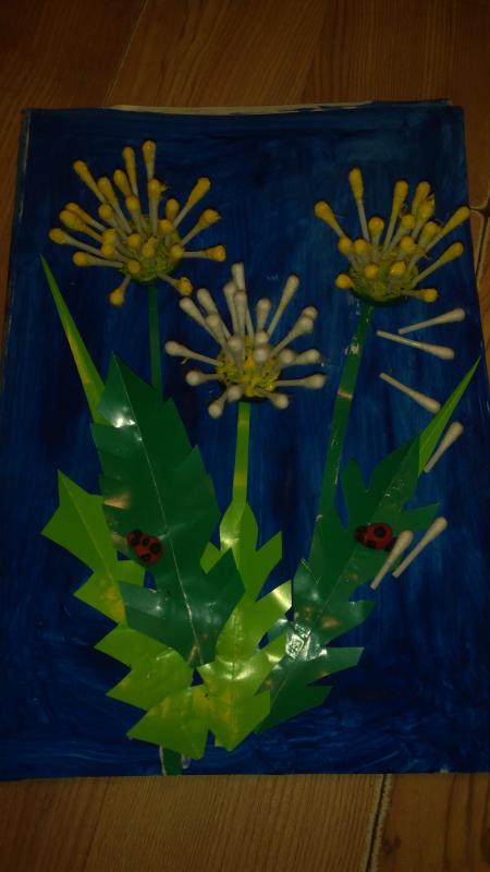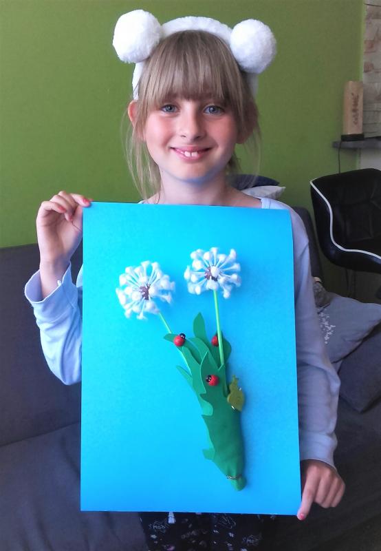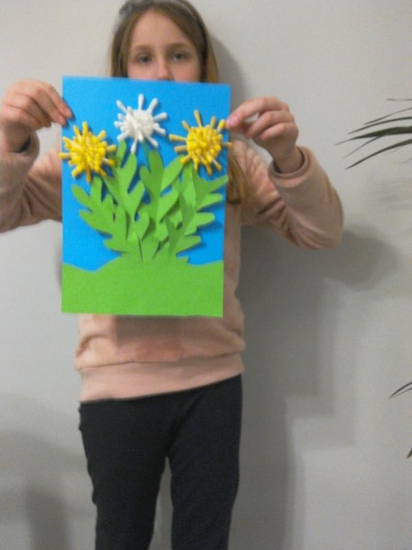 Dzieci z klasy 2a wykonały piękne prace przedstawiające wiosnę w ogrodzie dmuchawce i kwitnące drzewa.