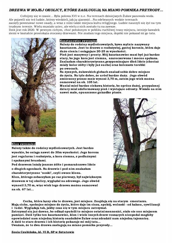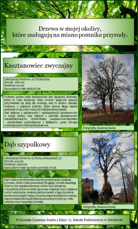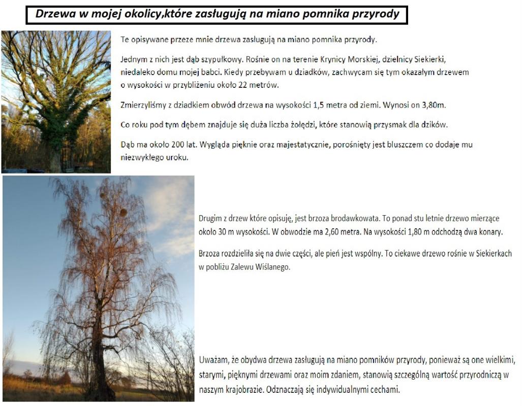 10 uczniów ze Szkoły Podstawowej w Sztutowie rywalizowało w pierwszym etapie konkursu. Do etapu II awansowali: Marcel Włoczkowski, Zuzanna Suska, Zofia Czubińska, Małgorzata Domalisz, Natalia Reszczyńska, Szymon Rymkiewicz i Oliwa Zbróg. II etap wymagał od uczestników pracy w terenie, gdyż musieli odnaleźć dwa drzewa zaslugujące na miano pomnika przyrody i opisać je, uzasadniając swój wybór. Tu najlepszymi okazali się Marcel Włoczkowski, Zuzanna Suska, Zofia Czubińska, którzy reprezentowali naszą szkołę w finale.