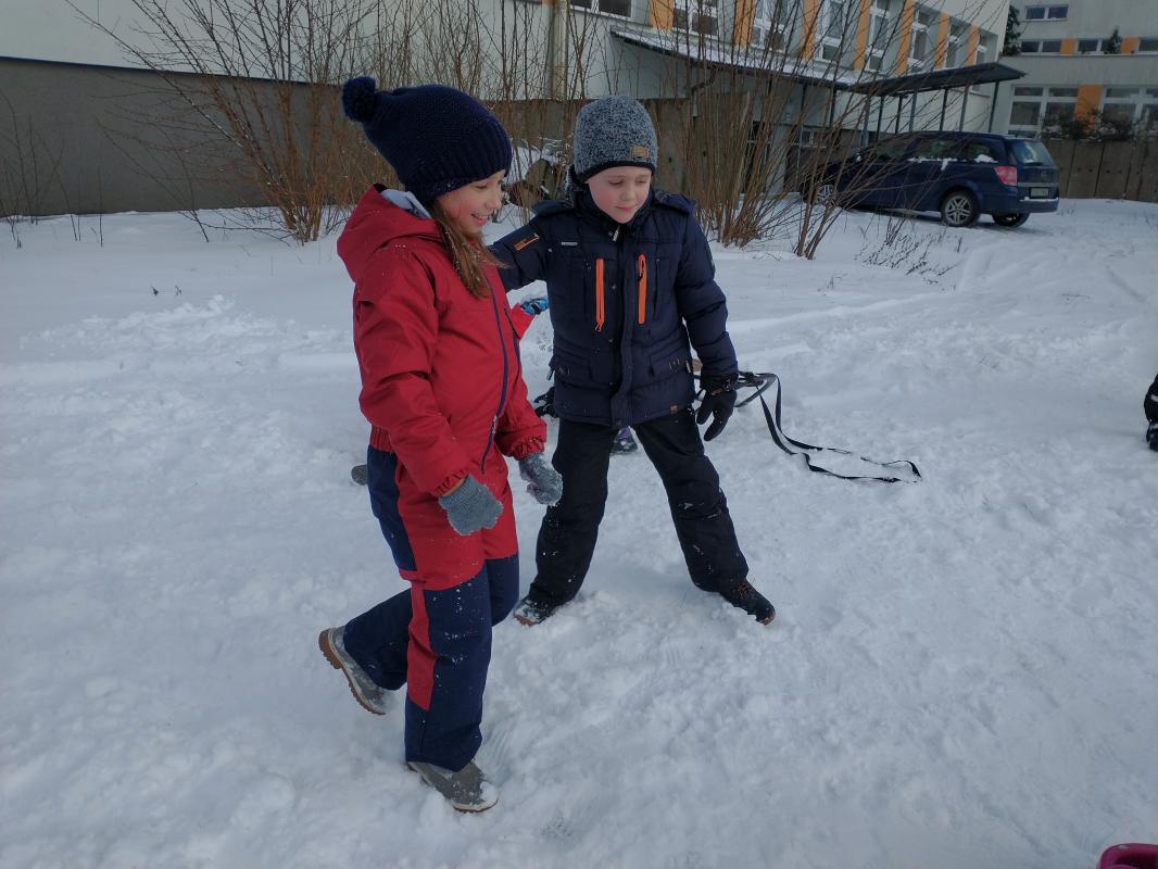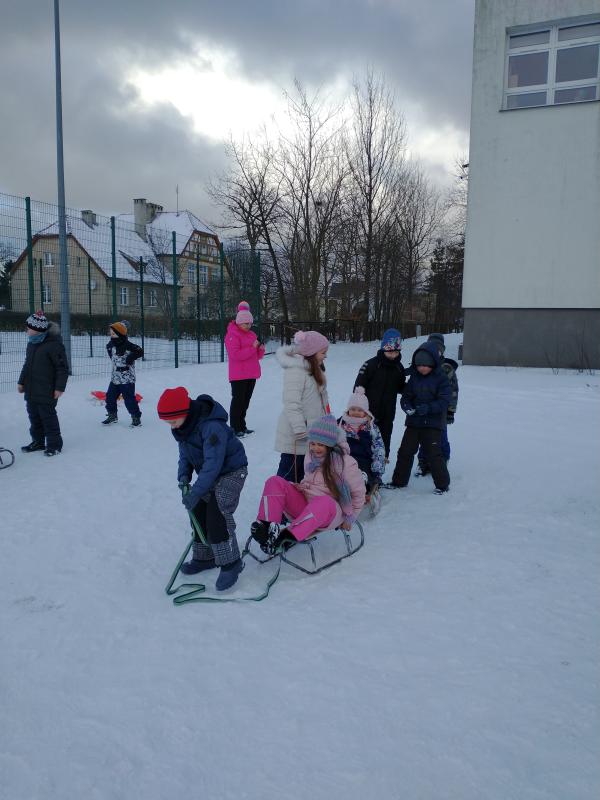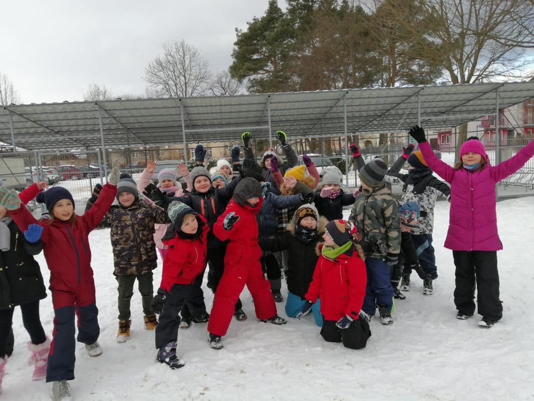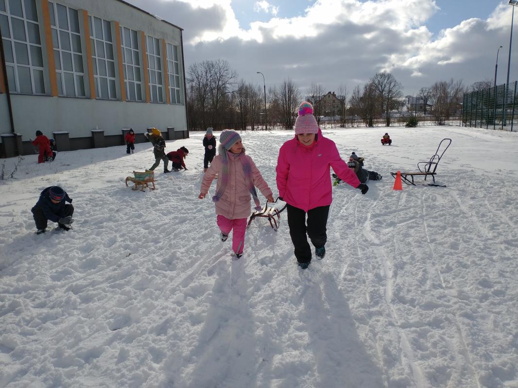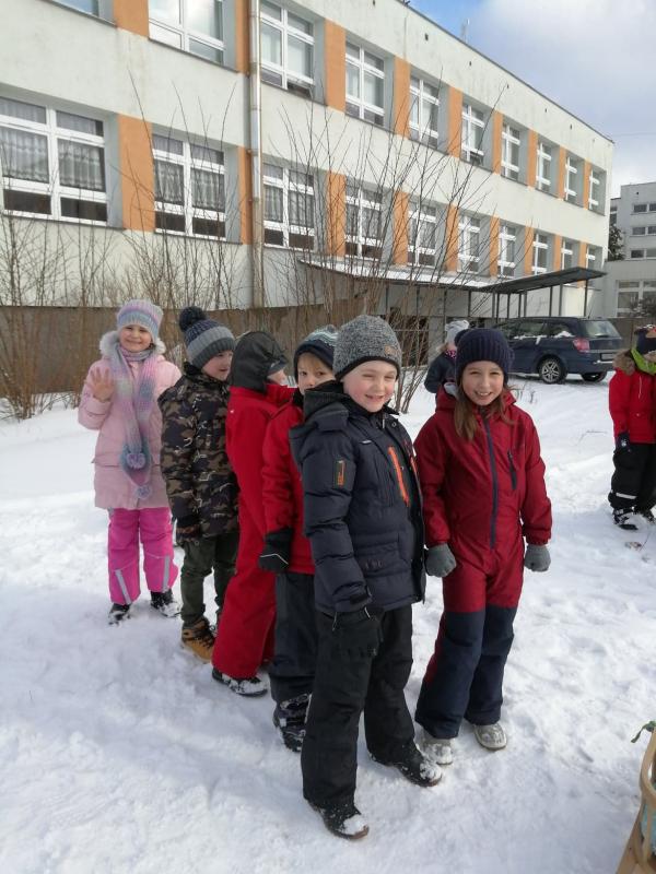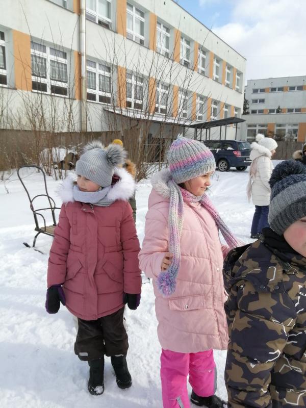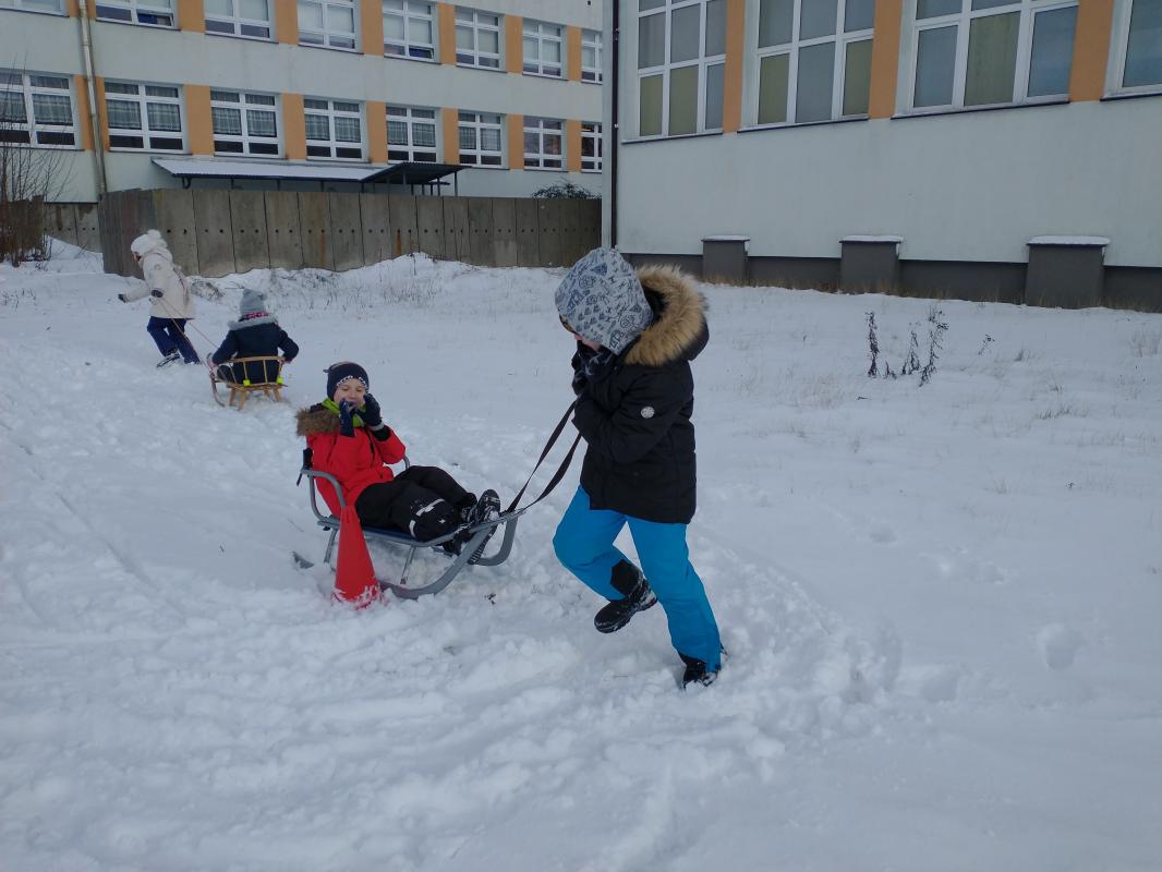 Pierwszaki przez dwa tygodnie czerpały radość ze wspólnych zabaw na śniegu na podwórku szkolnym.