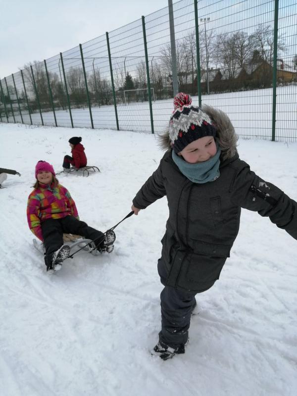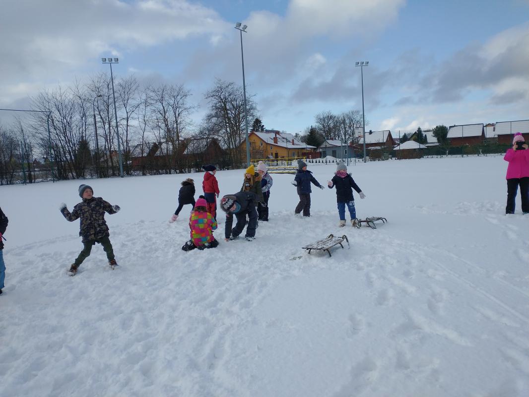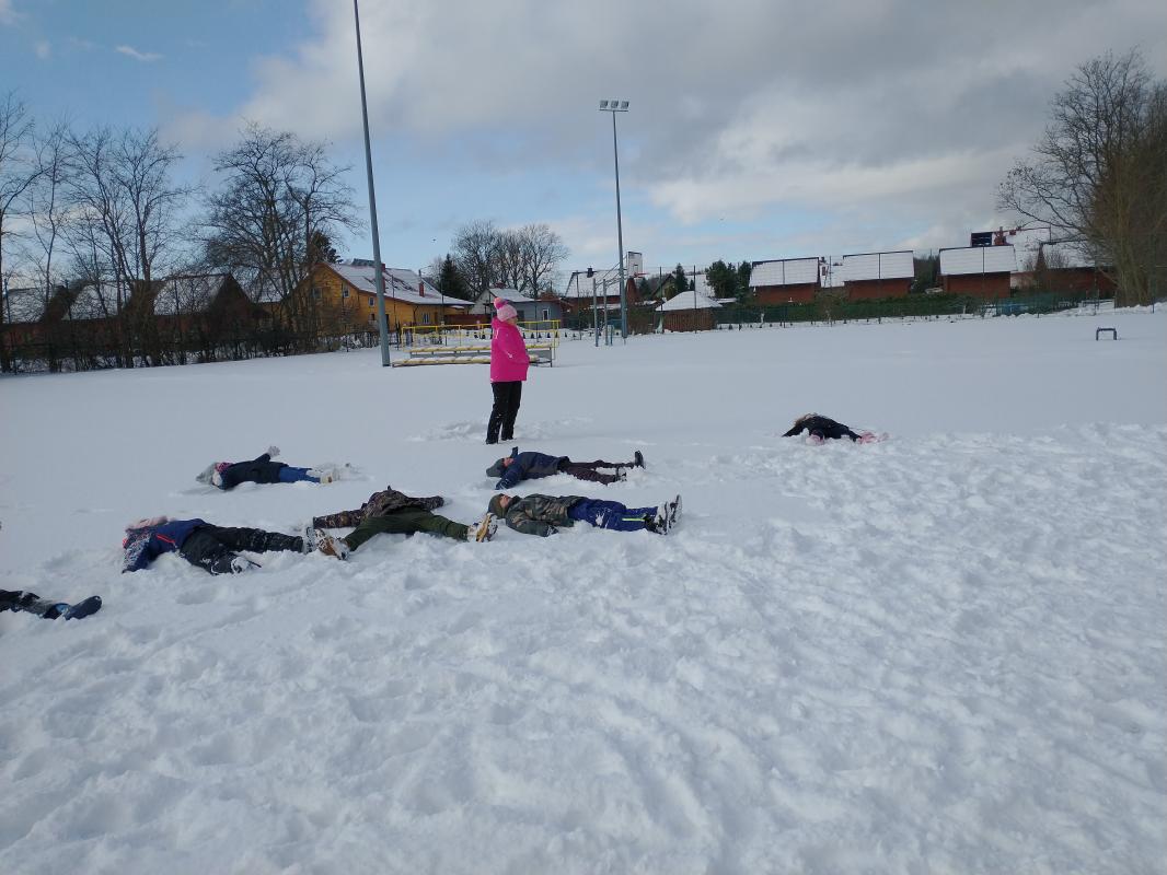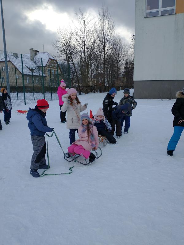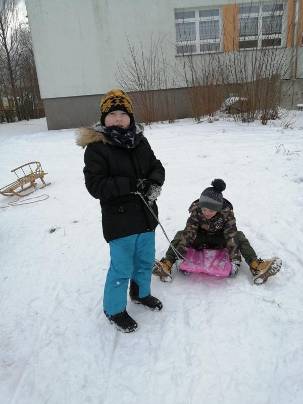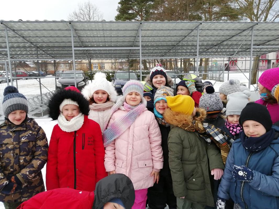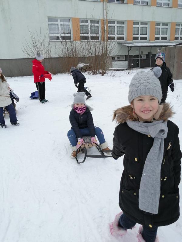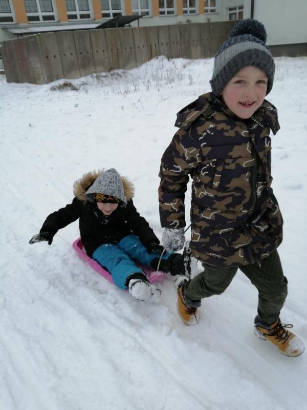 Pierwszaki przez dwa tygodnie czerpały radość ze wspólnych zabaw na śniegu na podwórku szkolnym.
