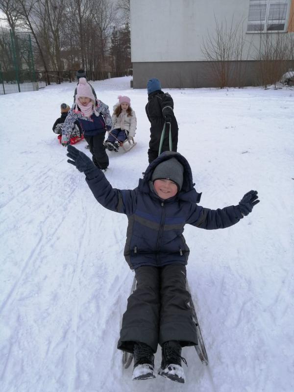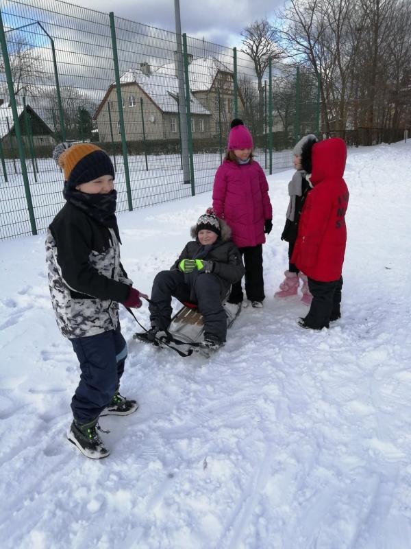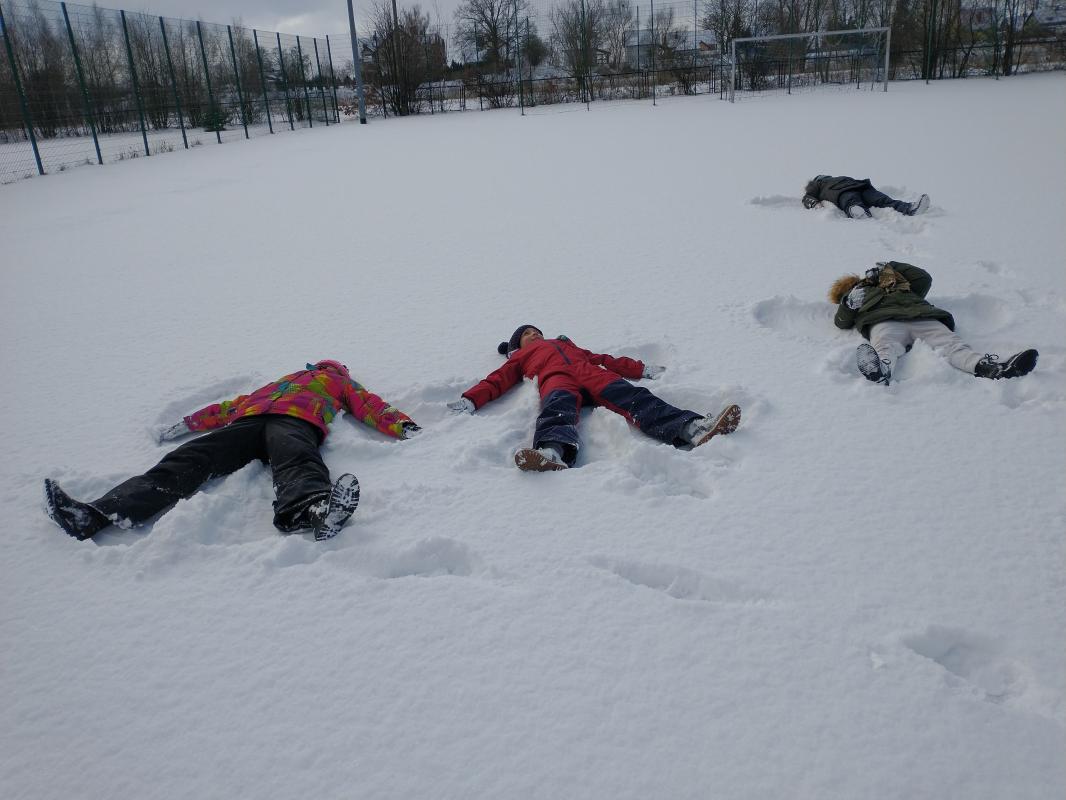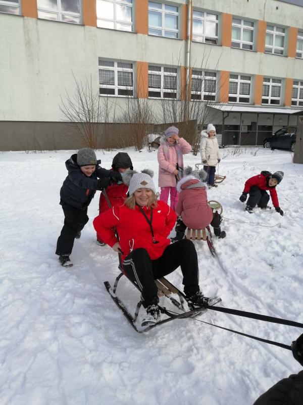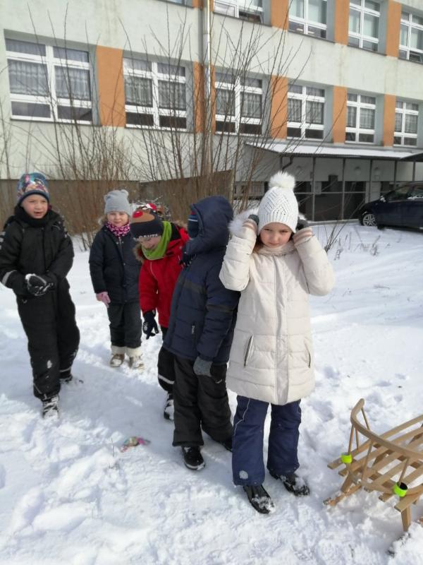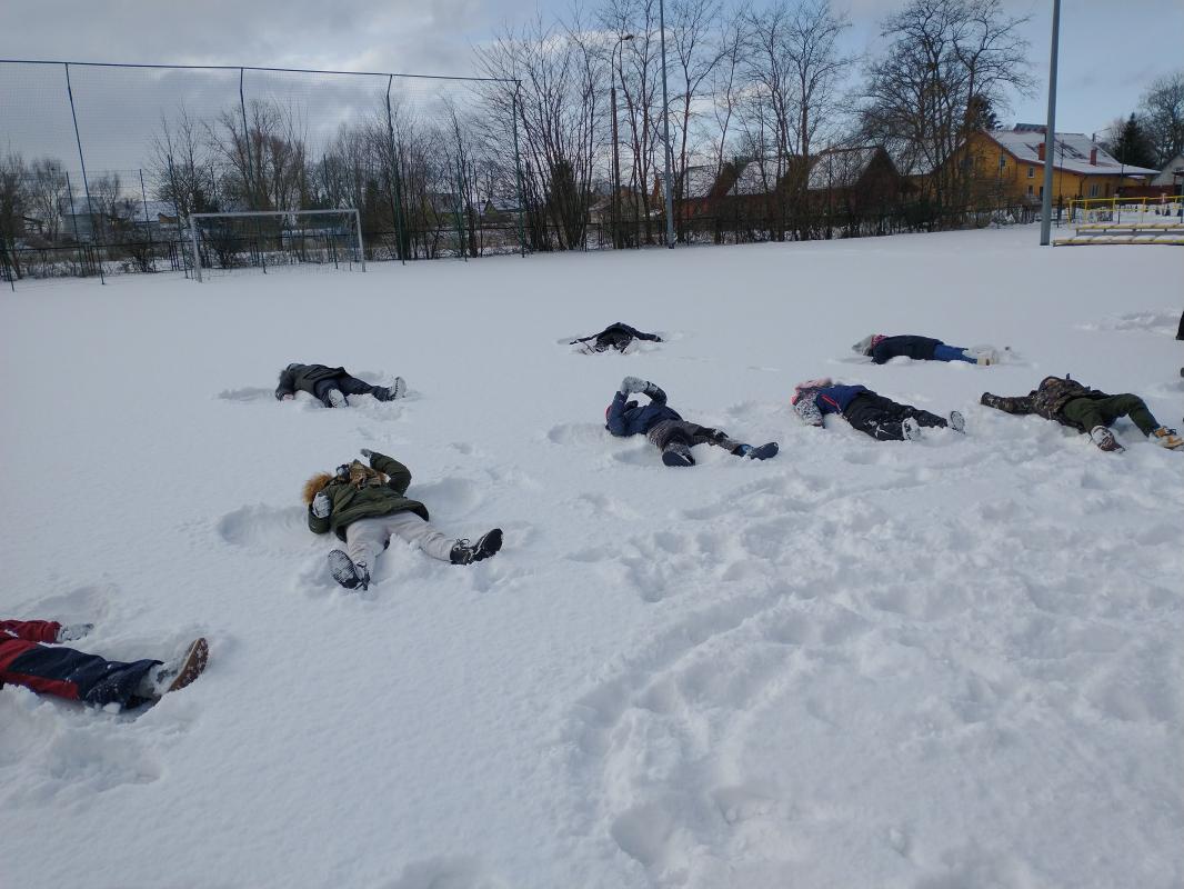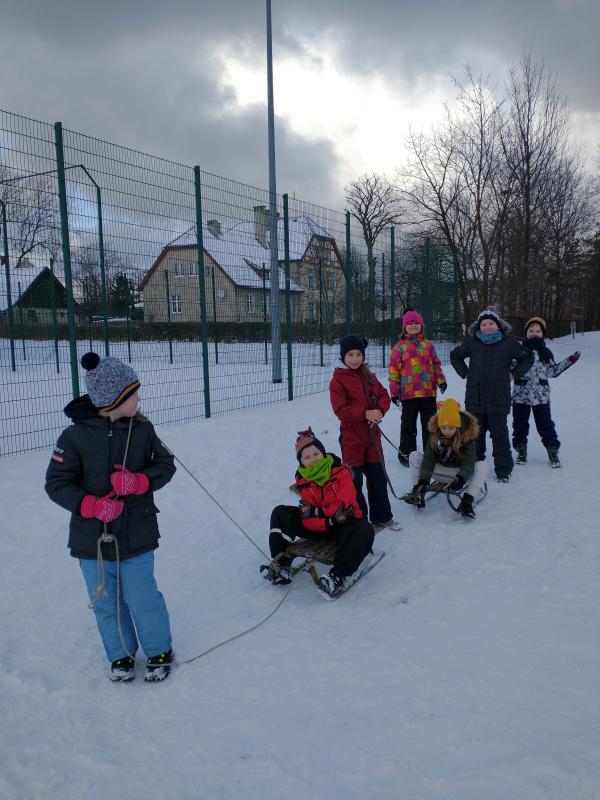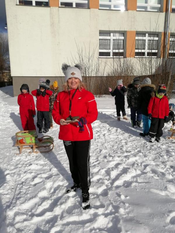 Pierwszaki przez dwa tygodnie czerpały radość ze wspólnych zabaw na śniegu na podwórku szkolnym.