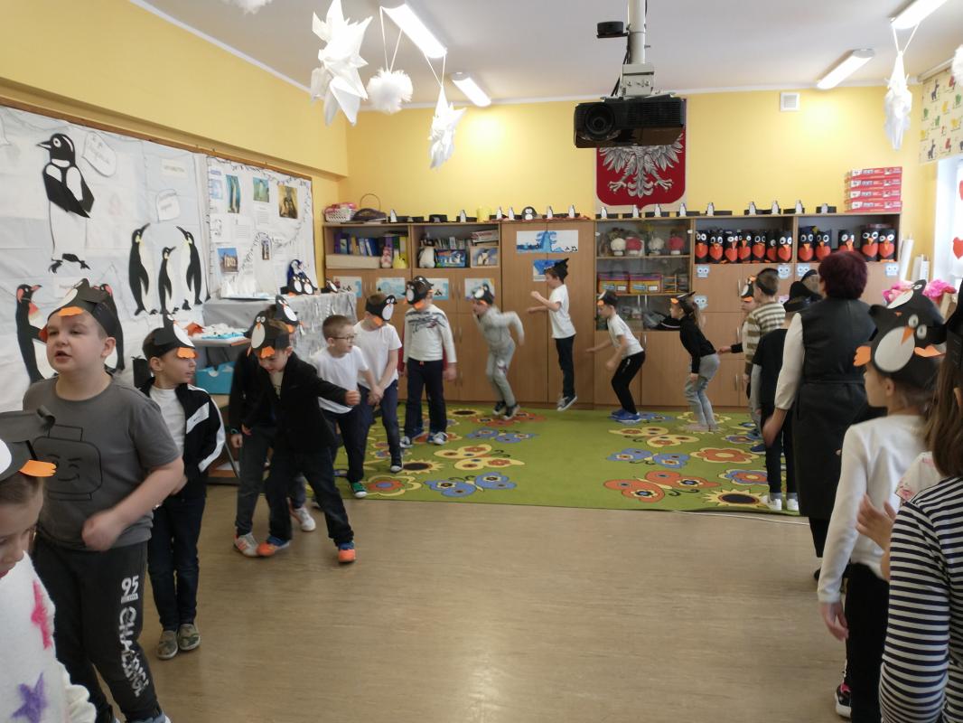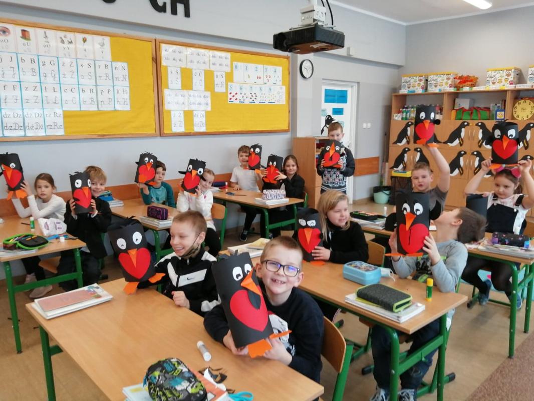 Dużo radości sprawiło uczniom wykonanie walentynkowego pingwina i zabawy ruchowe ze śpiewem.