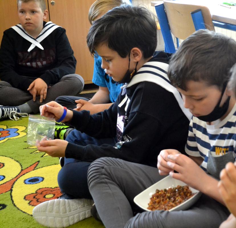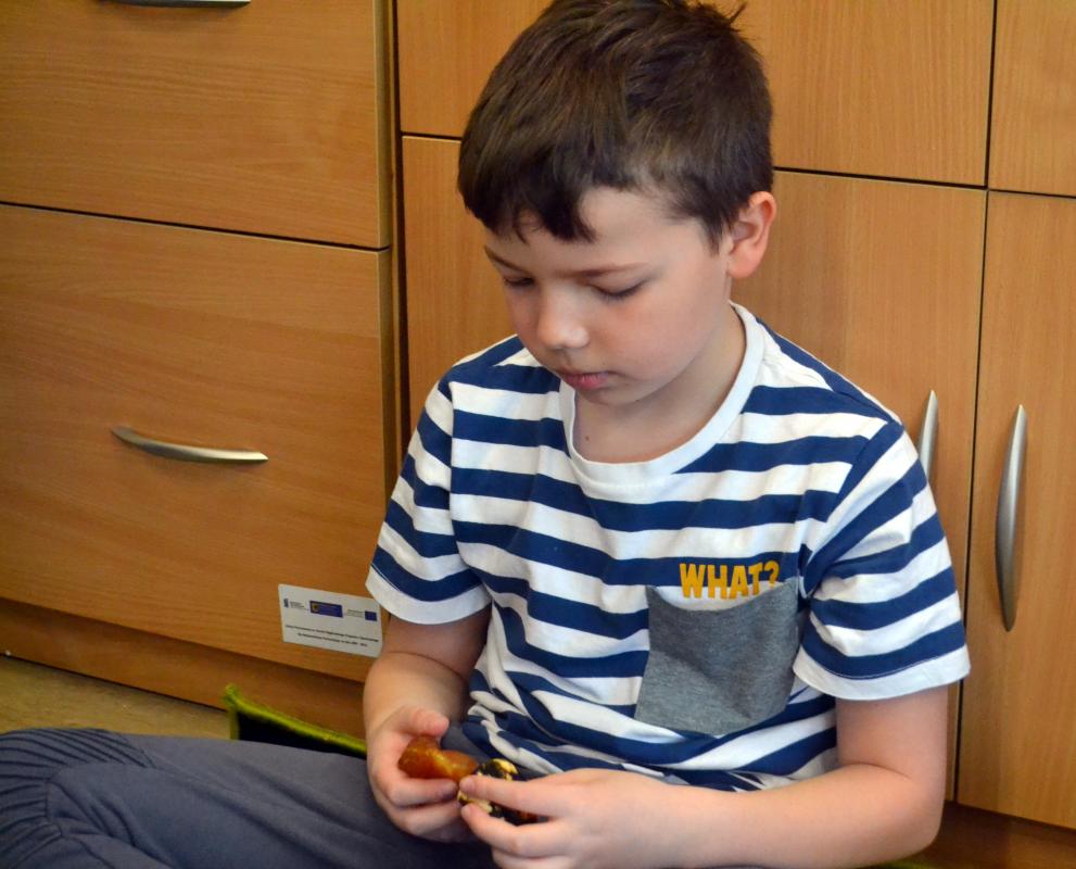 Dzieci otrzymały dość dużą dawkę wiedzy na temat jantaru. Miały okazję pogrzebać w śmieciu bursztynowym, zobaczyć inkluzję, dotknąć, powąchać nasze bałtyckie złoto oraz sprawdzić czy się pali.