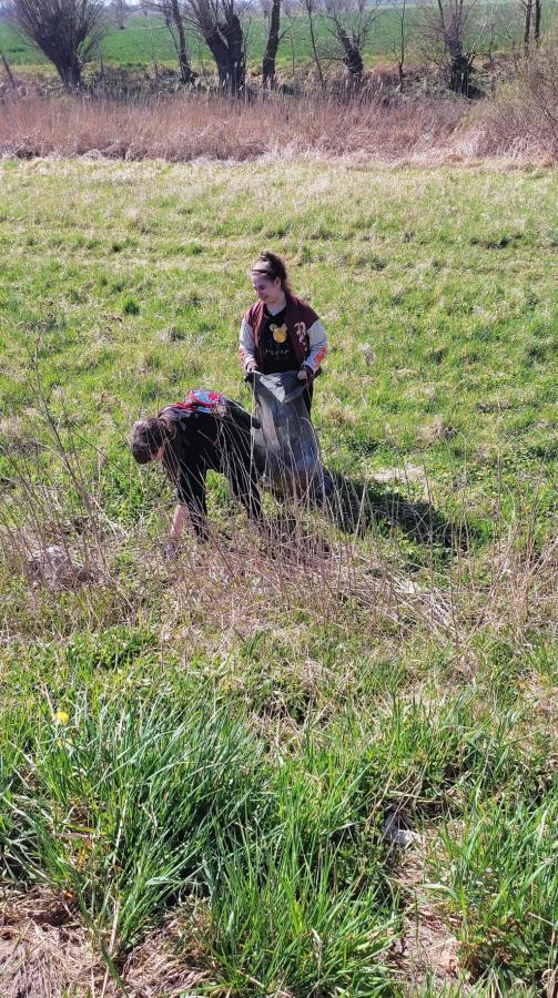 - Grupa sprzątała w miejscowości Łaszka. Rozpoczęła działania na przystanku w Łaszce. Tam czekała na nich Pani Teodozja Jachimczyk poproszona o pomoc przez Sołtysa wsi Łaszka- Anitę Knap. Grupa poruszała się nową drogą ułożoną z płyt i przemieszczała się w stronę Sztutowa.