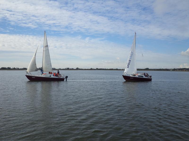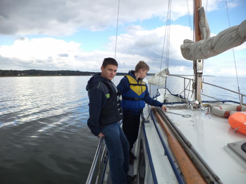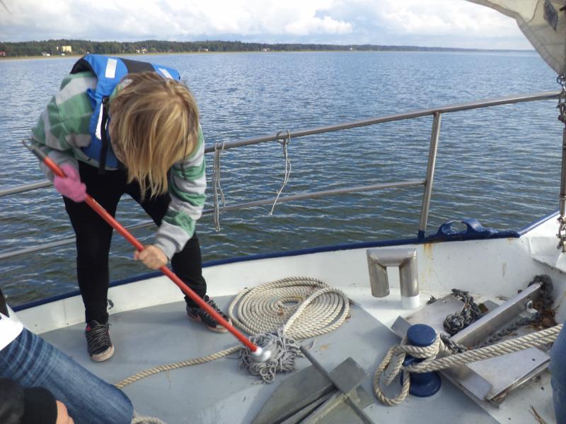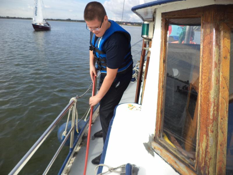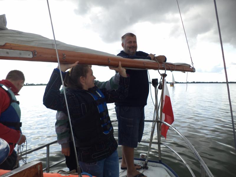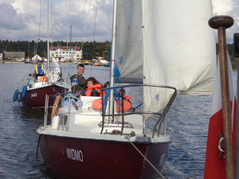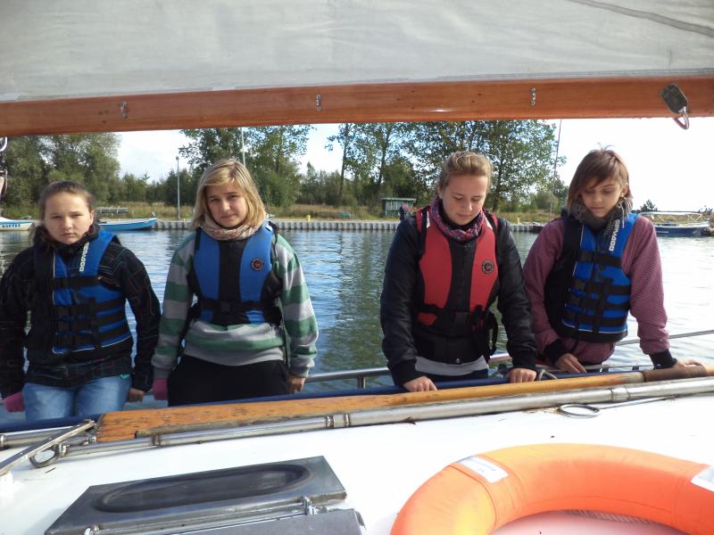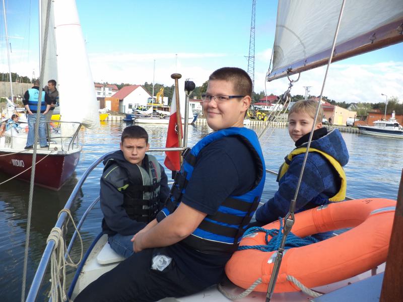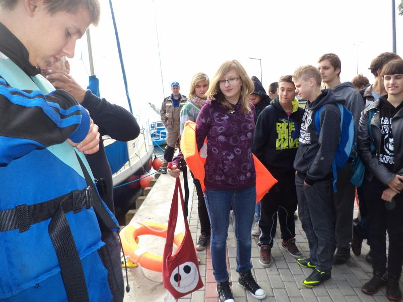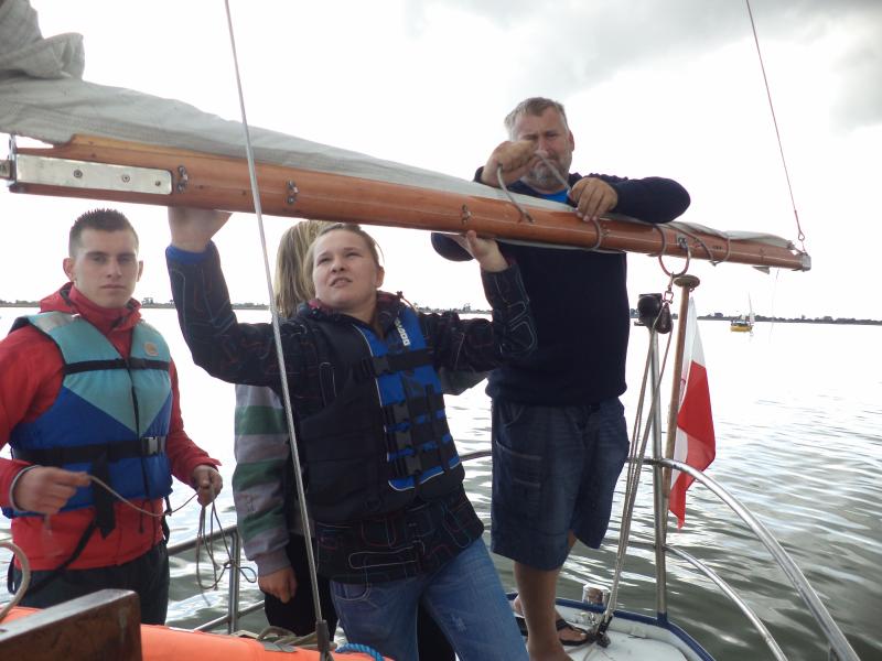 Kolejnym punktem warsztatów były zajęcia praktyczne na żaglówkach pod czujnym okiem Bogdana Glinieckiego. Po krótkim kursie bezpieczeństwa uczniowie zostali podzielenie na załogi i… wyruszyli na Zalew. Tam w praktyce poznawali budowę żaglówki, typy żagli, rodzaje wiatru i -co najważniejsze – sami próbowali swoich sił w żeglowaniu.