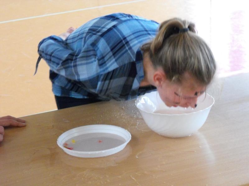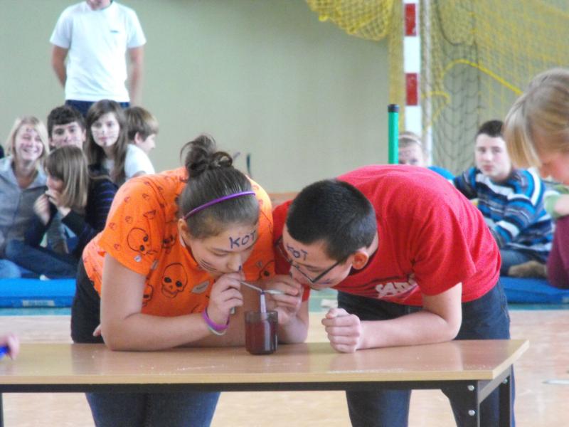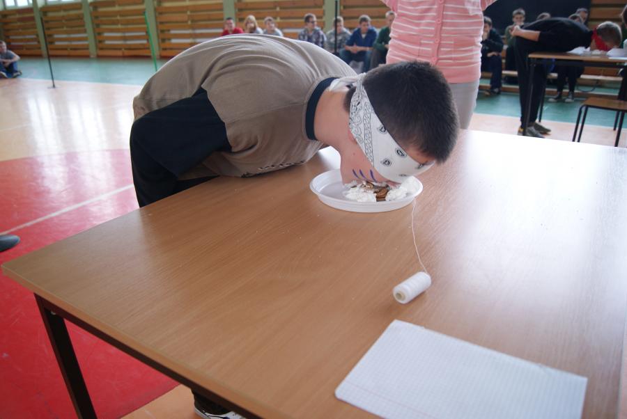 Uczniów klas I nie ominęło m.in. jedzenie „mix kanapki”, grupowe picie kisielu przez słomkę, szukanie monety w mące, karmienie z zamkniętymi oczami kolegi czy gwizdanie po spożyciu wody, banana i bułki tartej.