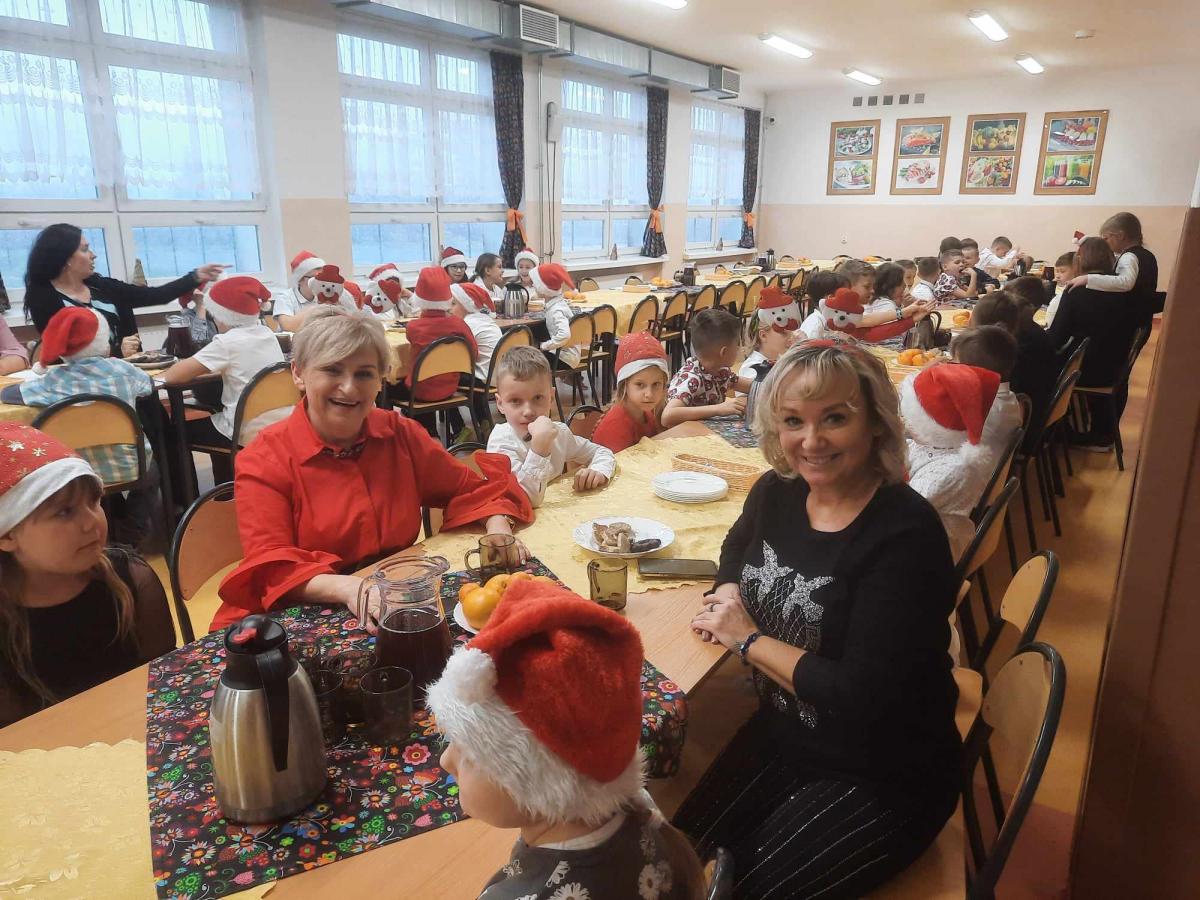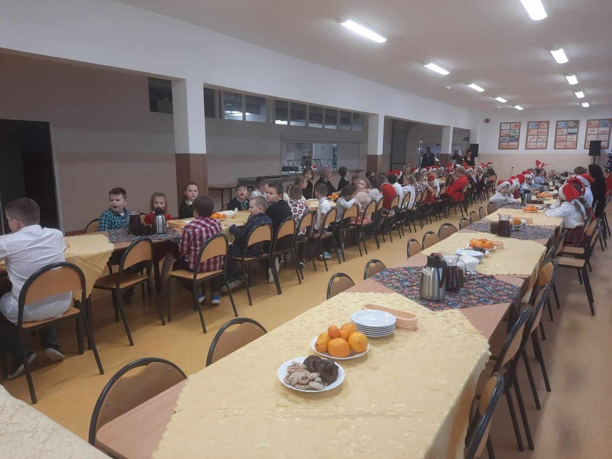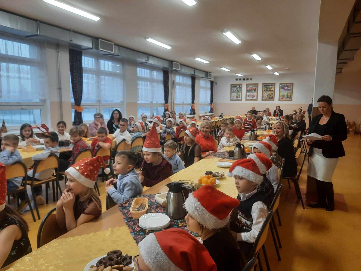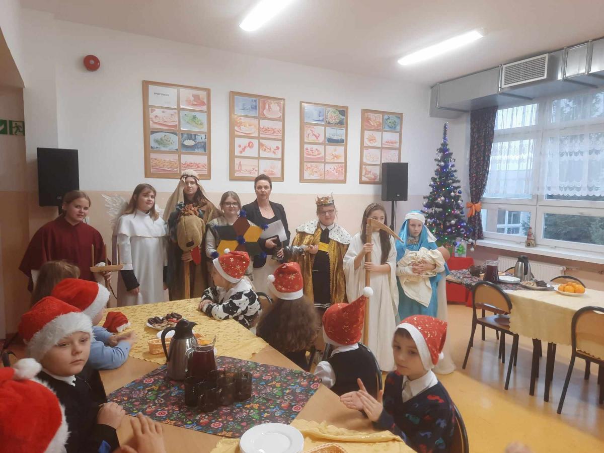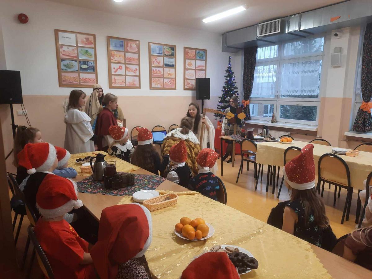 Tradycją naszej szkoły jest wspólne świętowanie przy stole. Jest nas dużo, więc klasy 1-3 miały swoje spotkanie wigilijne, następnie 4-5 oraz na zakończenie 6-8.