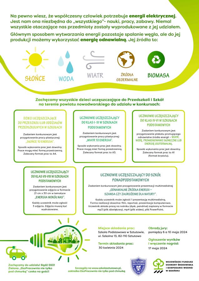 - Zadaniem konkursowym jest przygotowanie plakatu promującego odnawialne źródła energii- wiatr, wodę, promieniowanie słoneczne lub energię geotermalną.