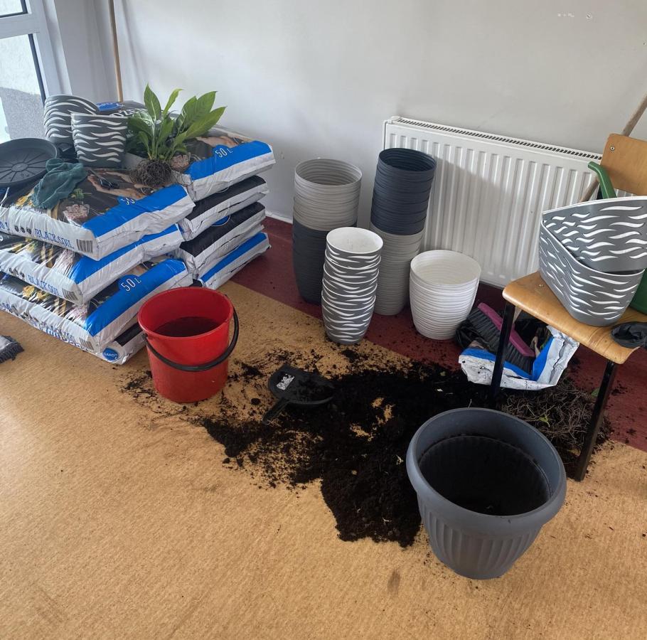 - Przesadzenie do większych donic roślin posadzonych w latach ubiegłych w szkole.