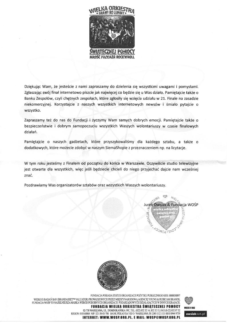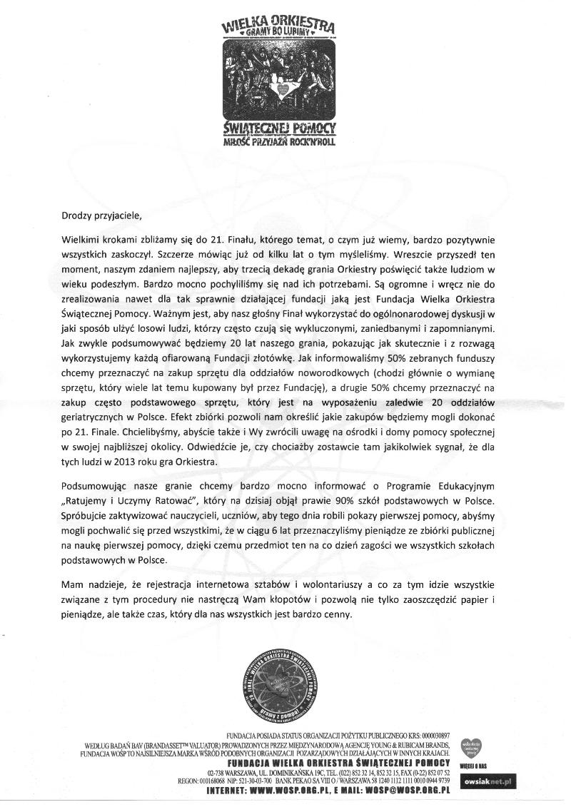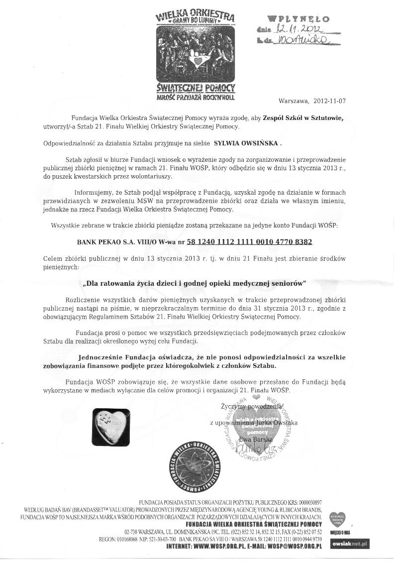 Szkoła w Sztutowie uzyskała zgodę na utworzenie Sztabu 21. Finału Wielkiej Orkiestry Światecznej Pomocy. W tym roku będziemy organizowali publiczną zbiórkę pieniężną pod hasłem „Dla ratowania życia dzieci i godnej opieki medycznej seniorów”. Finał w szkole i całej Polsce odbędzie się 13 stycznia 2013 roku. Wspierać nas będzie 7 wolontariuszy z puszkami. Wszystkich chętnych serdecznie zapraszamy do współpracy.