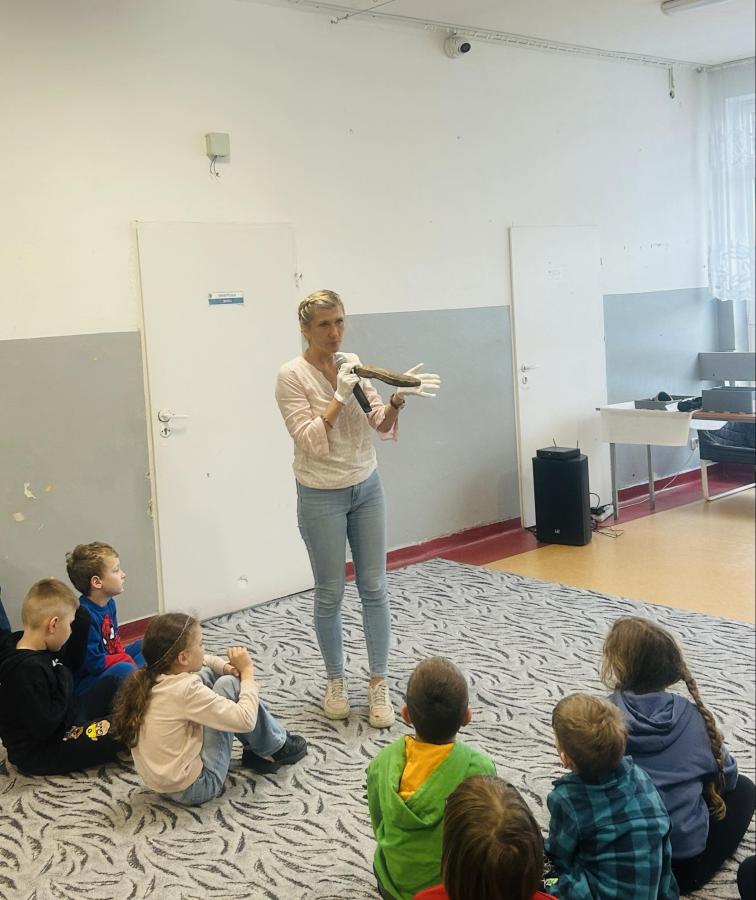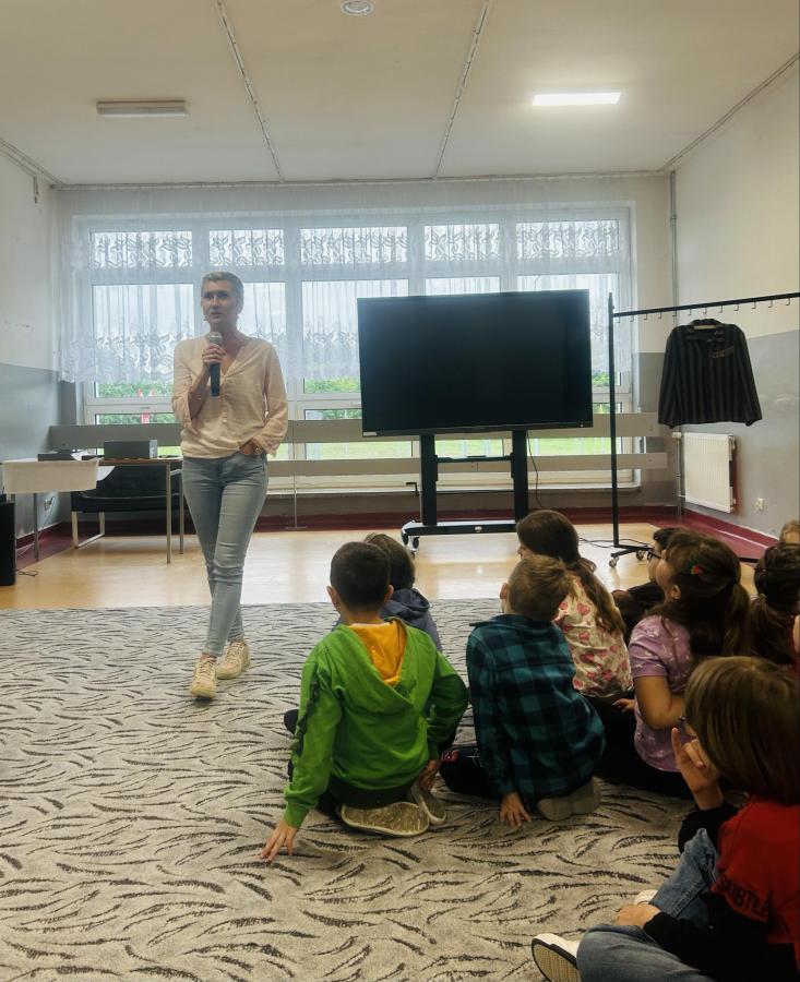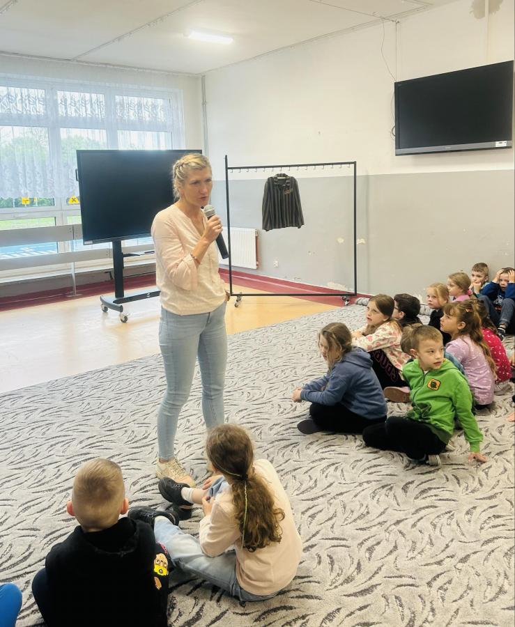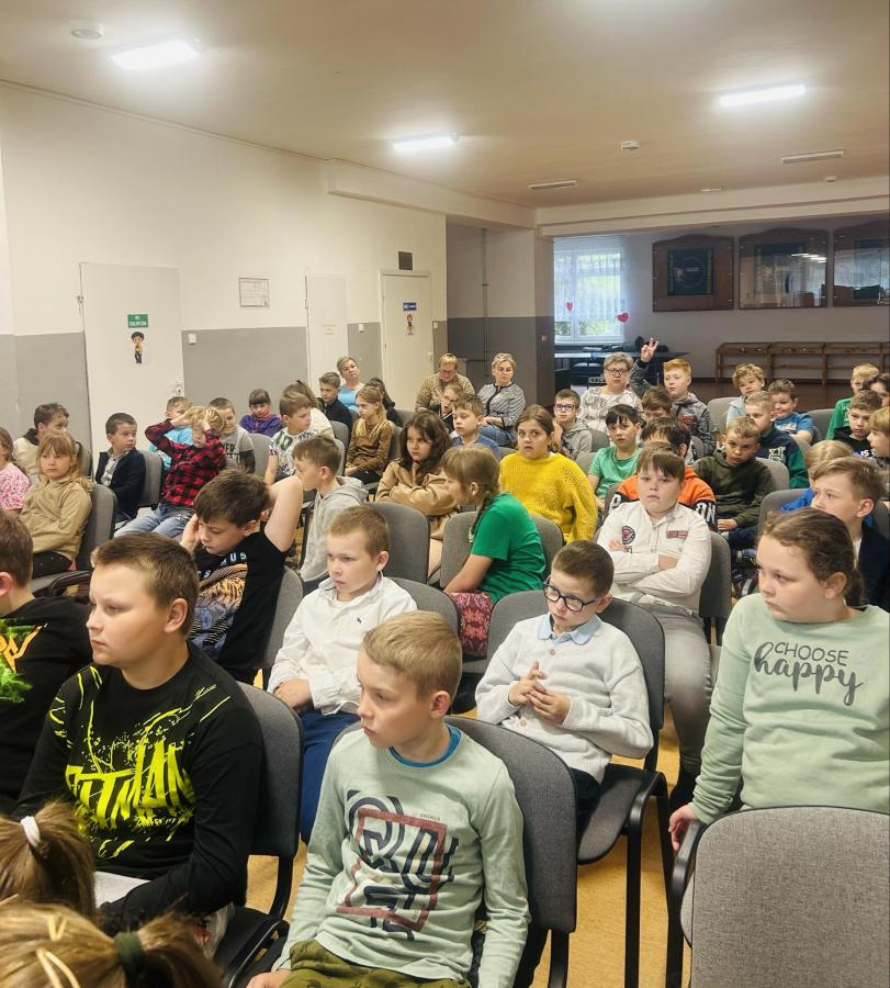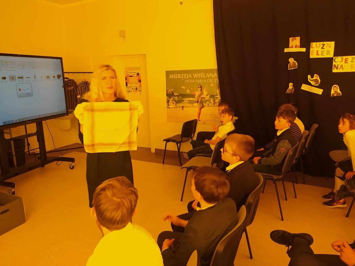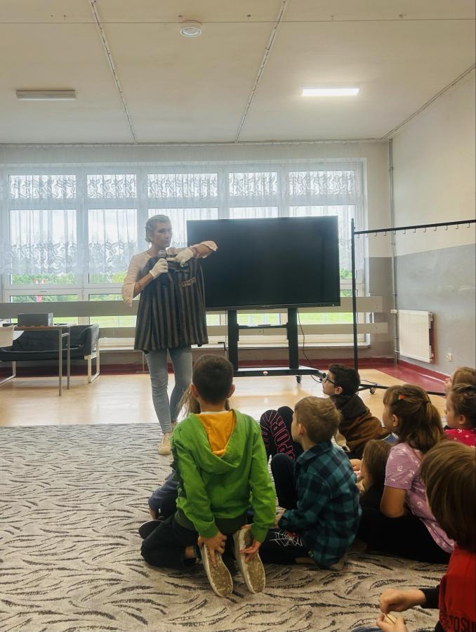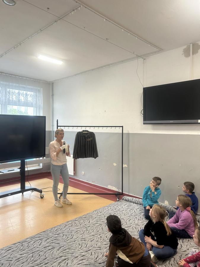 Dzieci zadawały mnóstwo pytań, żywo reagowały na wszystkie przedstawiane treści. Wśród uczniów znaleźli się ochotnicy, którzy wsparli prelegenta w prezentacji obiektów obozowych.