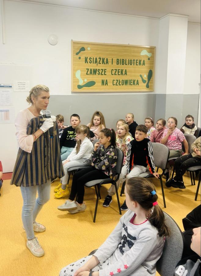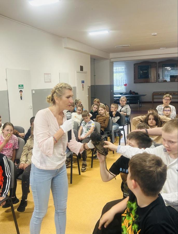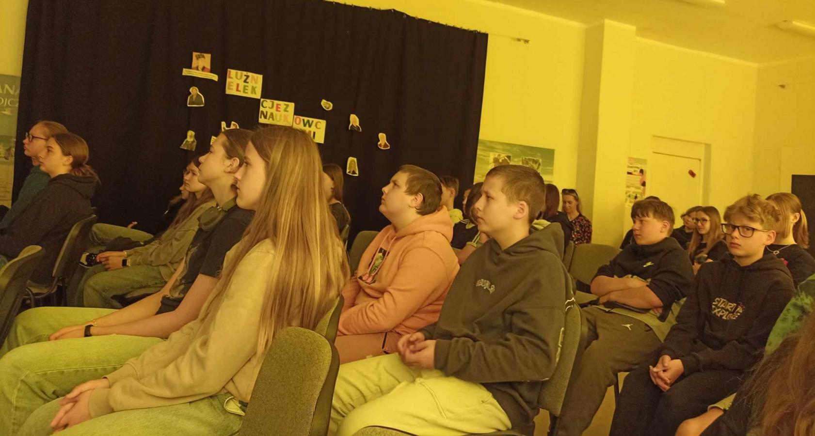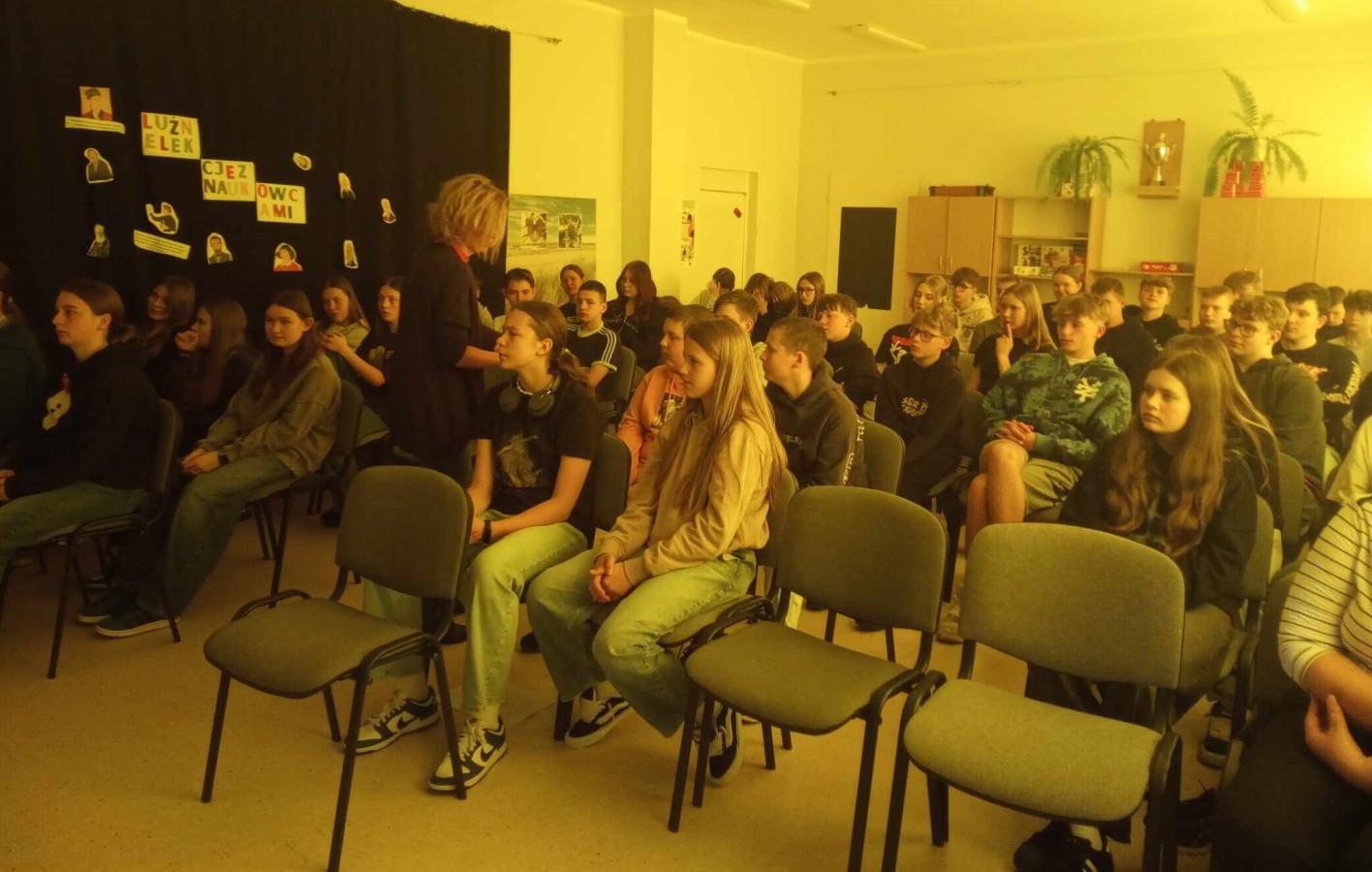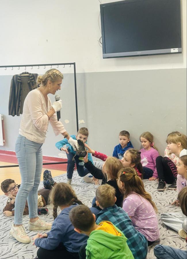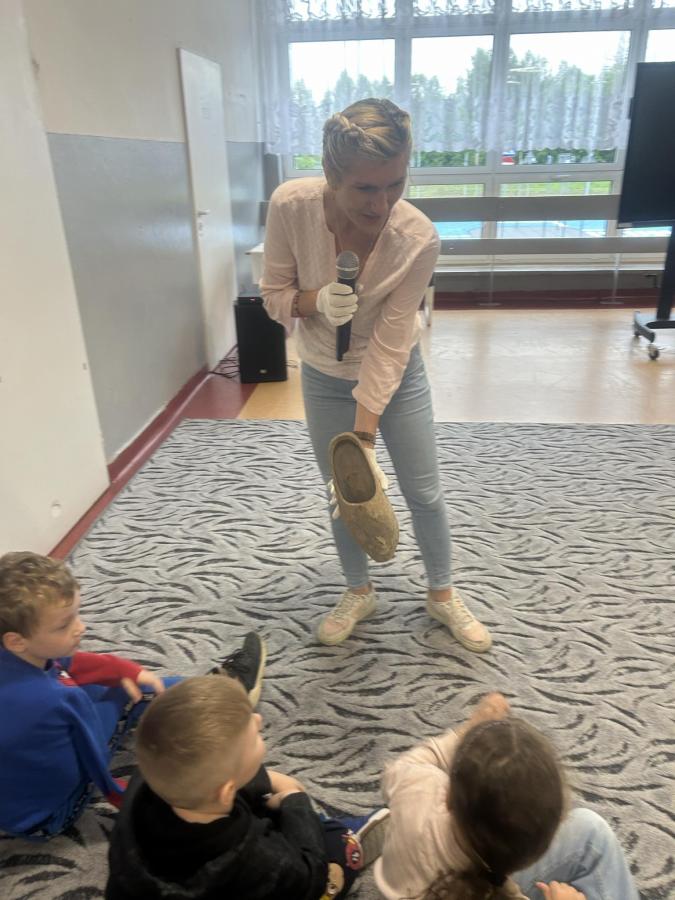 Dzieci zadawały mnóstwo pytań, żywo reagowały na wszystkie przedstawiane treści. Wśród uczniów znaleźli się ochotnicy, którzy wsparli prelegenta w prezentacji obiektów obozowych.