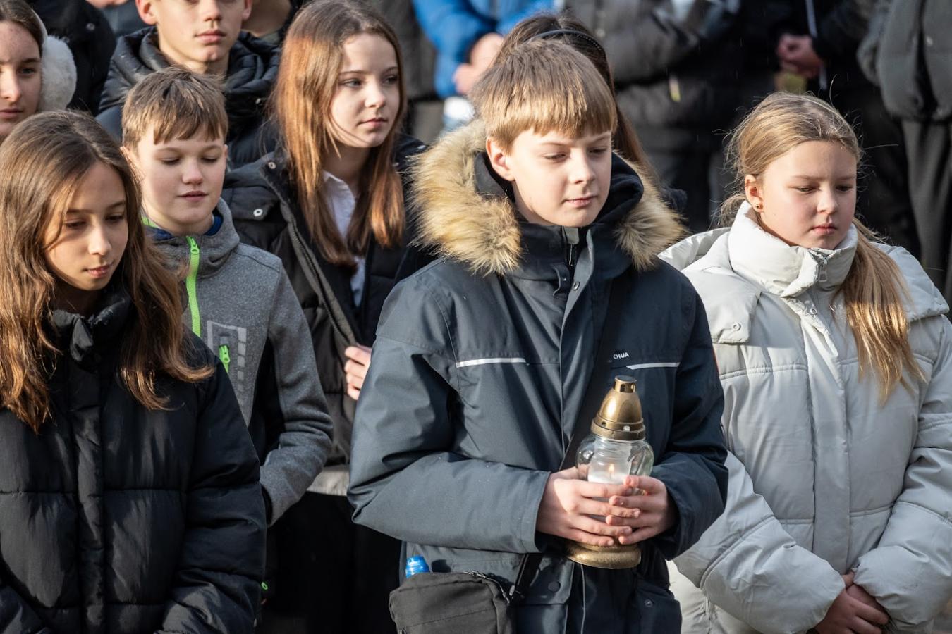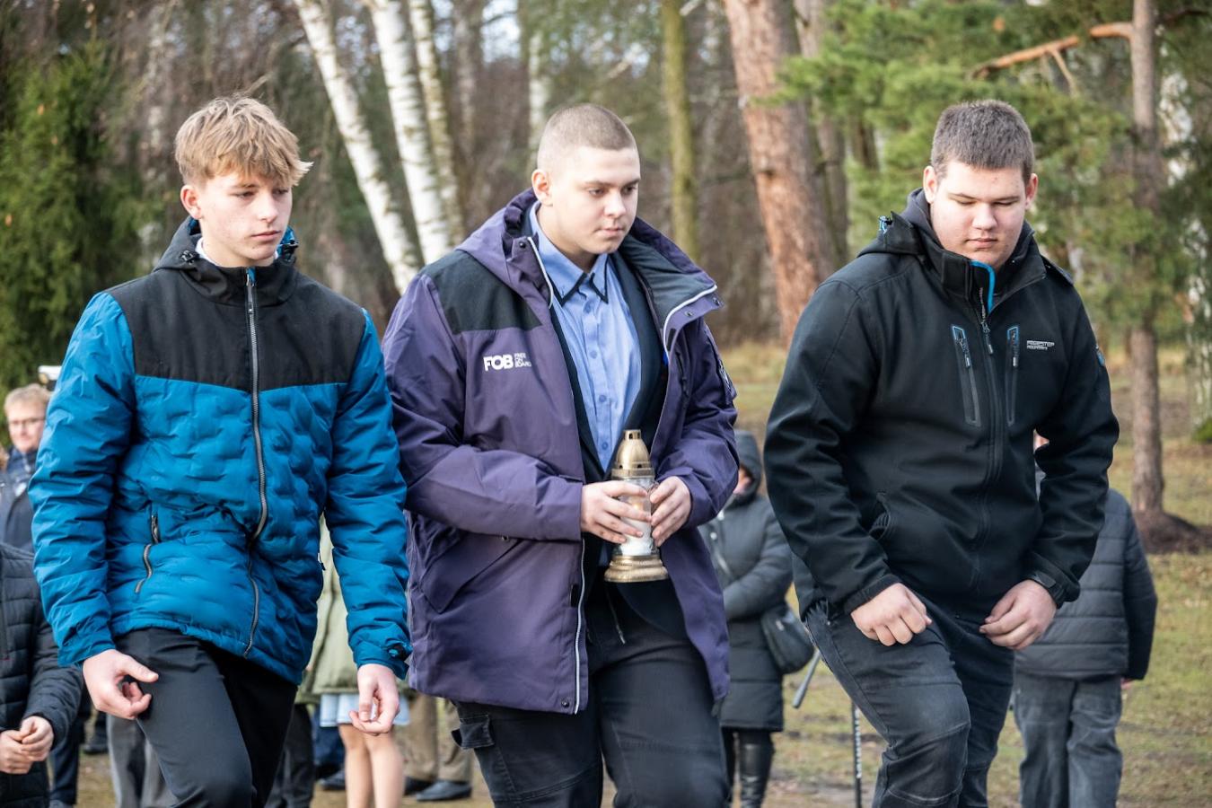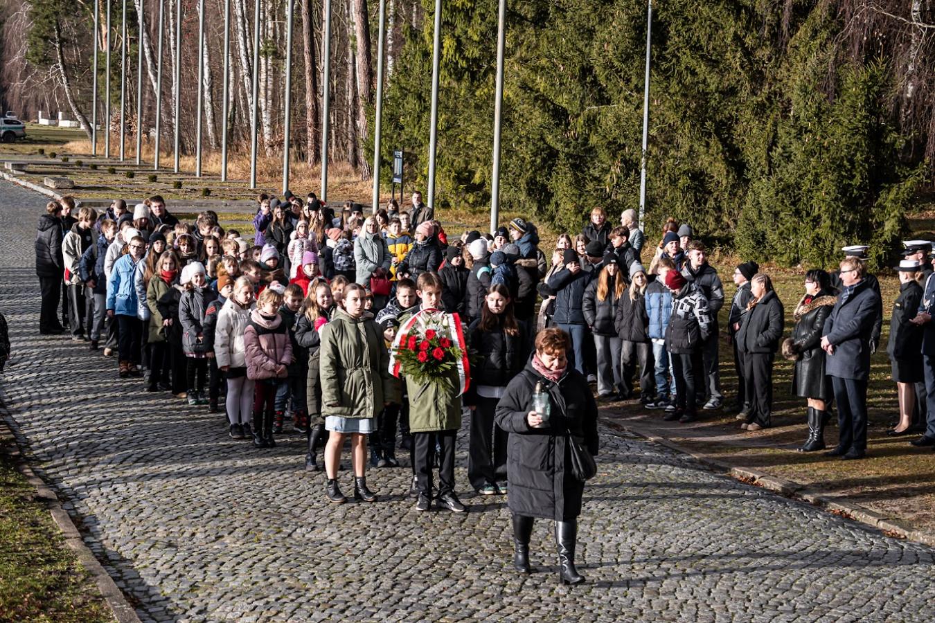 Społeczność szkoły oraz goście udają się za sztandarem szkoły przed Pomnik Walki i Męczeństwa na terenie Muzeum Stutthof. Składamy kwiaty, zapalamy znicze. Jest czas na minutę ciszy oraz wysłuchanie przedstawiciela opiekuna miejsca pamięci.