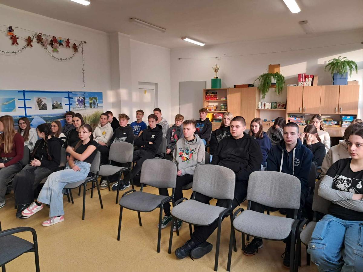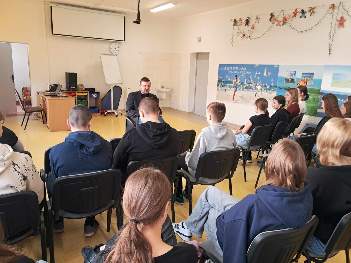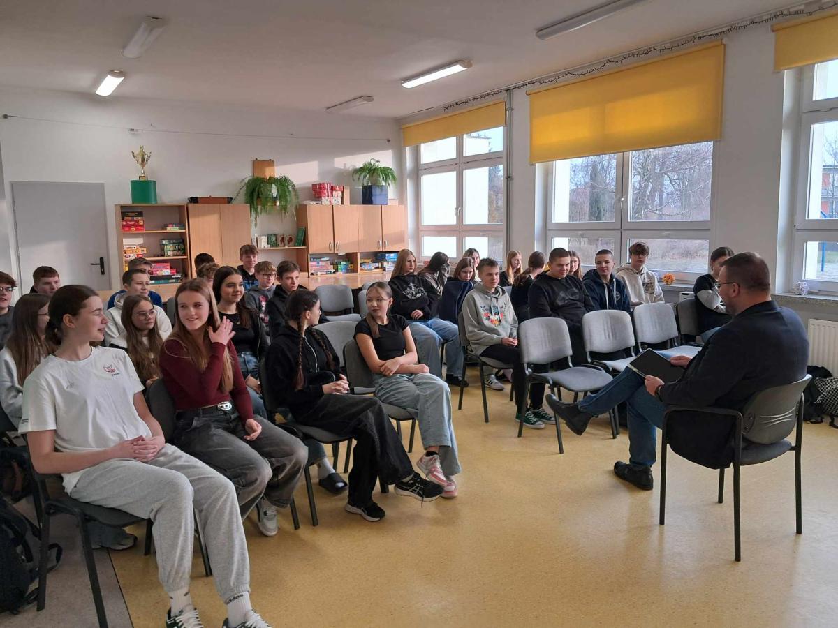 W szkole w Sztutowie odbyło się spotkanie ósmoklasistów z Wójtem Gminy Sztutowo- Robertem Zielińskim. Uczniowie rozmawiali o obowiązkach i pracy wójta.