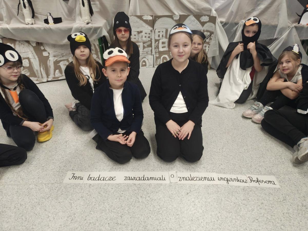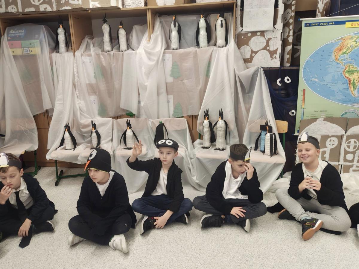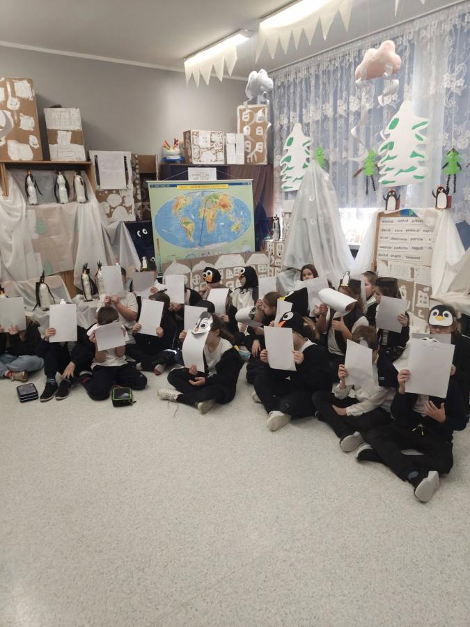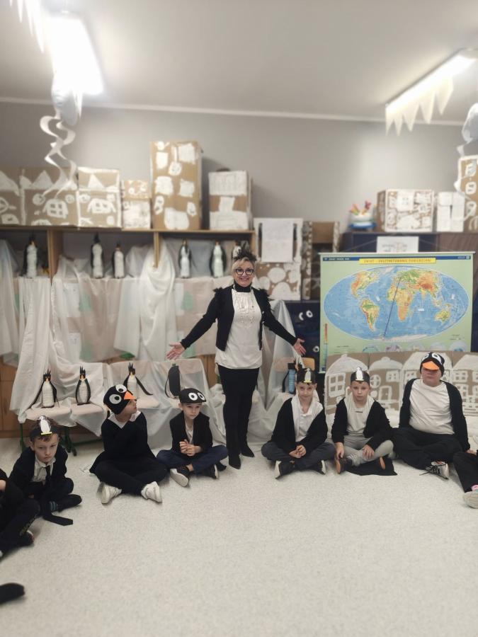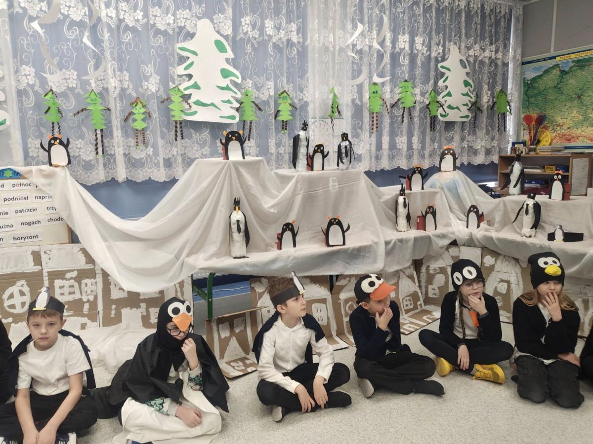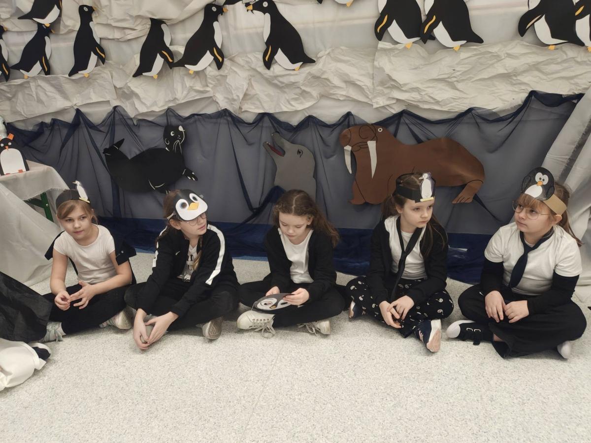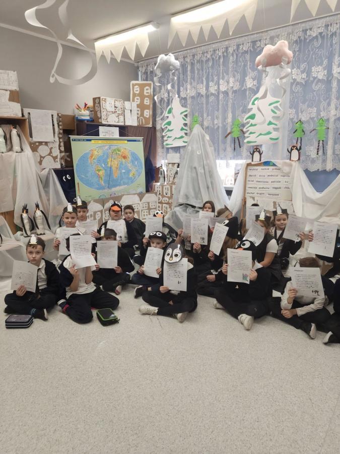 Dziś klasy drugie przeniosły się w sam środek mroźnej Antarktydy i… zamieniły się w pingwiny! Sala lekcyjna zmieniła się w zimowy krajobraz, a dzieci miały okazję poczuć się jak bohaterowie „Zaczarowanej zagrody” Centkiewiczów.