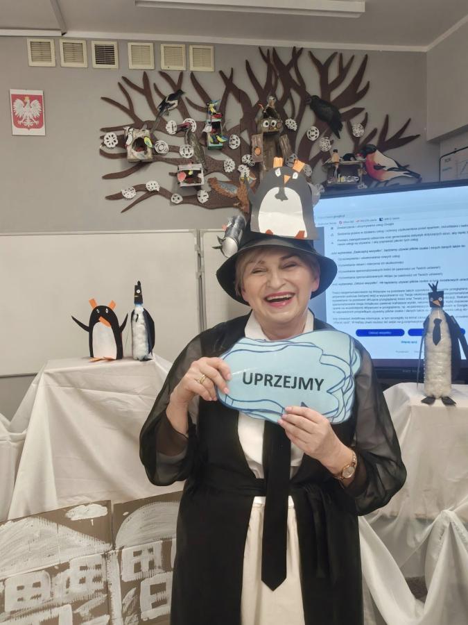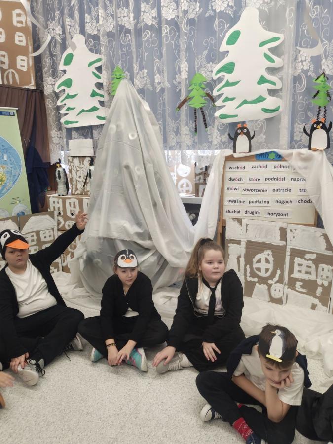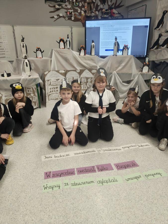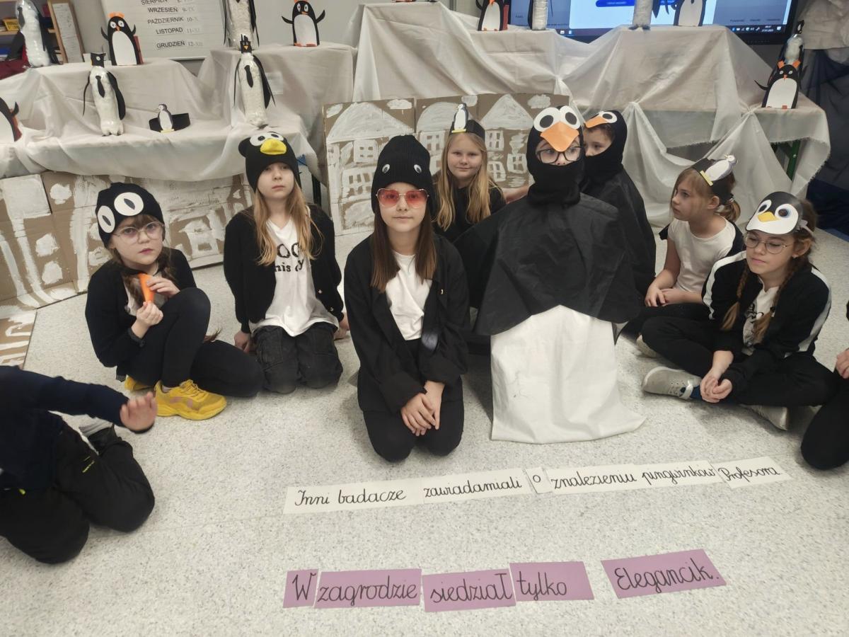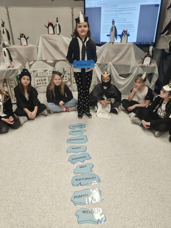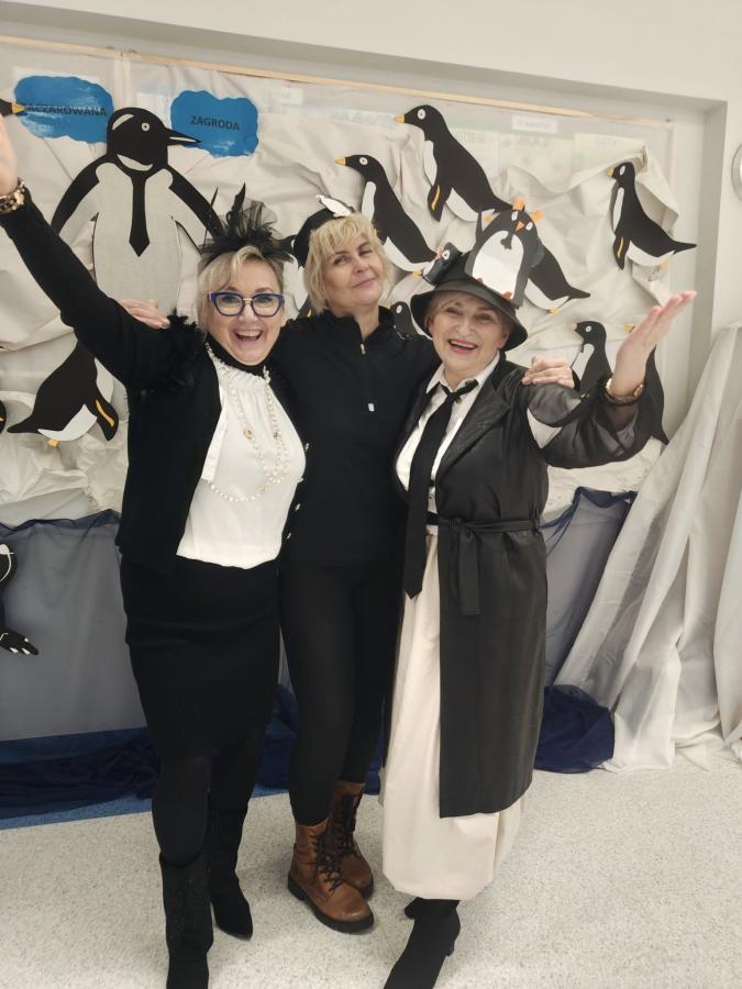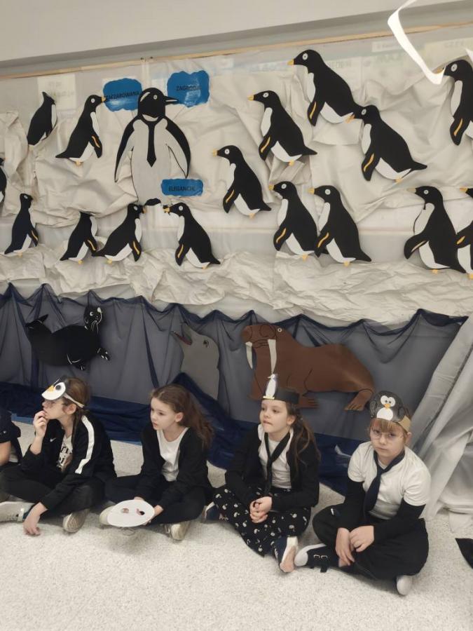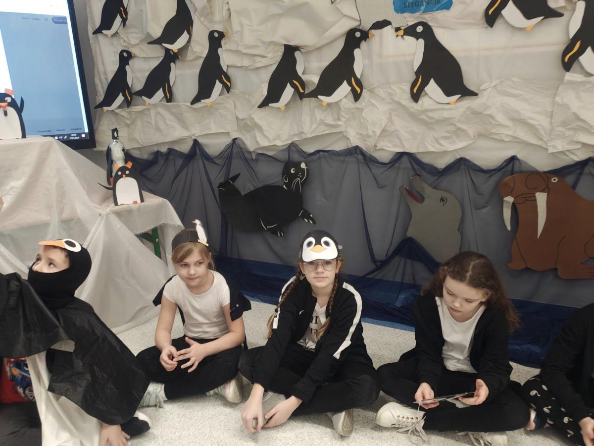 Uczniowie układali zdania z rozsypanek wyrazowych, kolorowali dyktando, a wszystkie wyrazy krążyły wokół tematyki pingwinów i Antarktydy. Nawet nauczycielki włączyły się w zabawę, przebierając się za pingwiny!