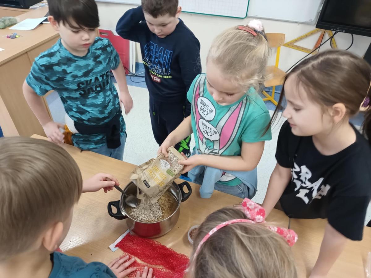 Dziś klasa 1b samodzielnie wykonała kulki z ptasią karmą i rozwiesiła je wokół szkoły!