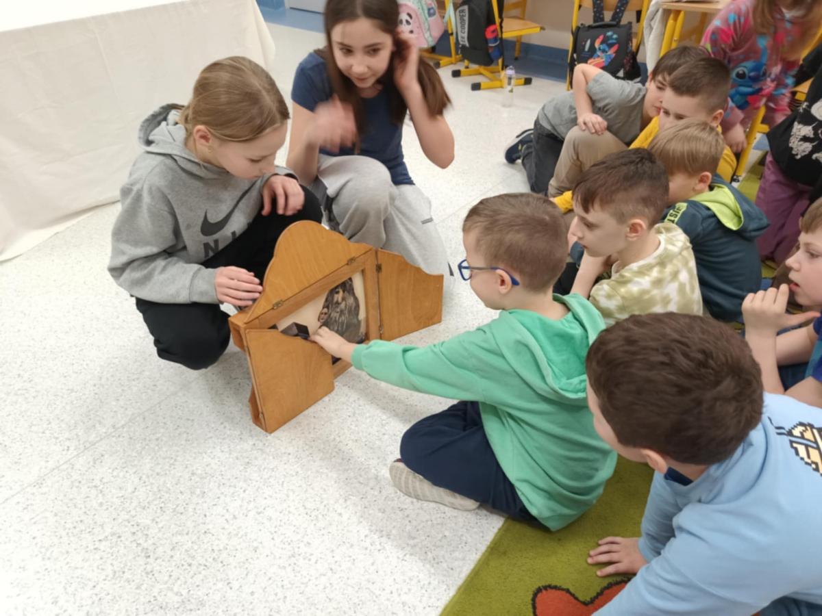 Następnie nasi goście ze starszej klasy zaprezentowali teatrzyk obrazkowy kamishibai i sztukę pt. „Lew w Paryżu”.