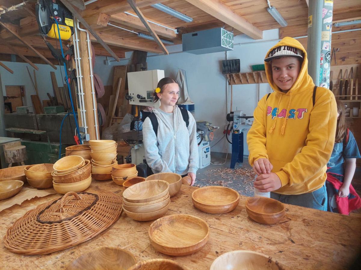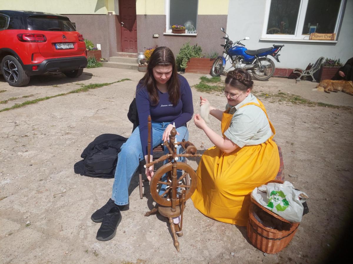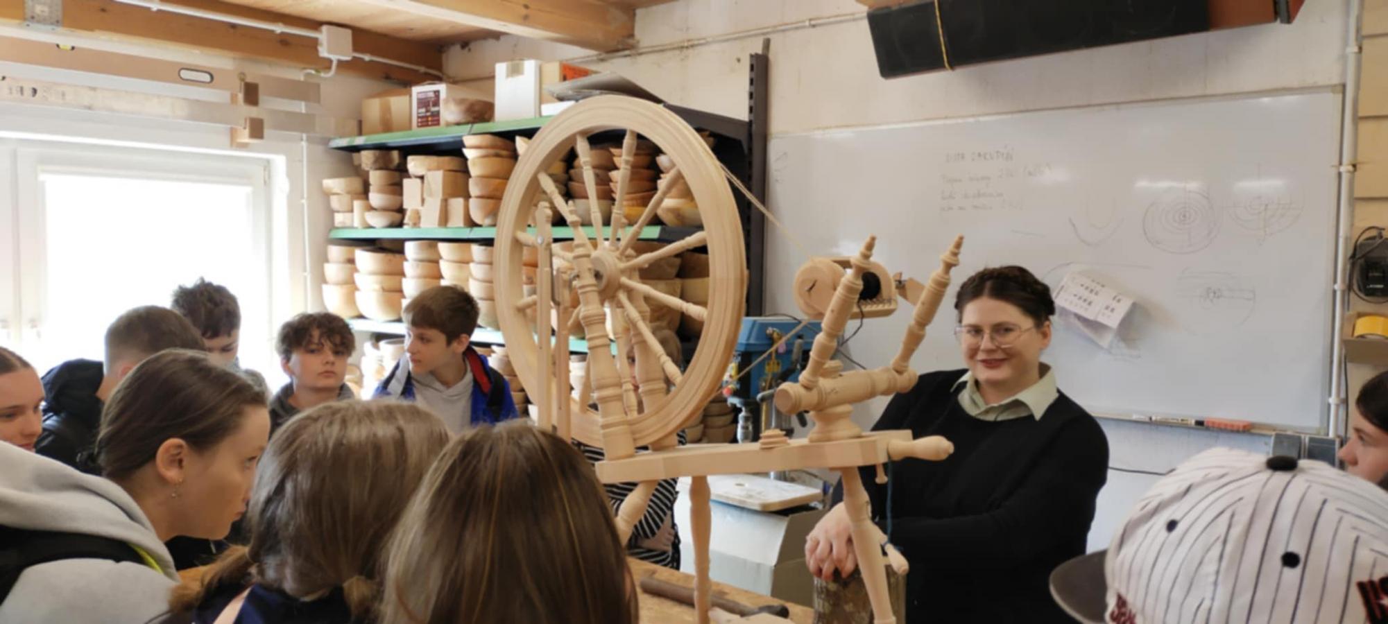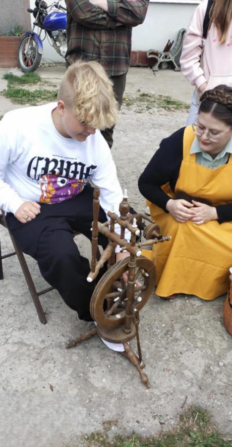 Tam ugościli nas Tomasz Kibort i Adrianna Jachimczyk, którzy pokazali, jak się toczy miski i przędzie na kołowrotku.