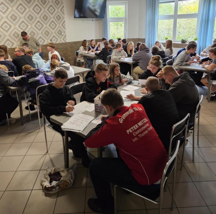 Rozpoczęliśmy dzień od podsumowania całego spotkania. Uczniowie – zarówno z Polski, jak i z Niemiec – oceniali, co najbardziej im się podobało, które aktywności były dla nich najciekawsze, a które mogłyby być inaczej zorganizowane. Wspomniano m.in. warsztaty, wizytę w KL Stutthof, plażę, wspólne projekty, wycieczki, dyskotekę i – oczywiście – wspólne pływanie kajakami, które było jednym z najbardziej emocjonujących momentów całej wymiany.