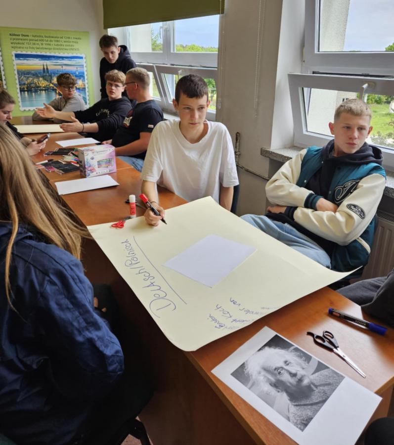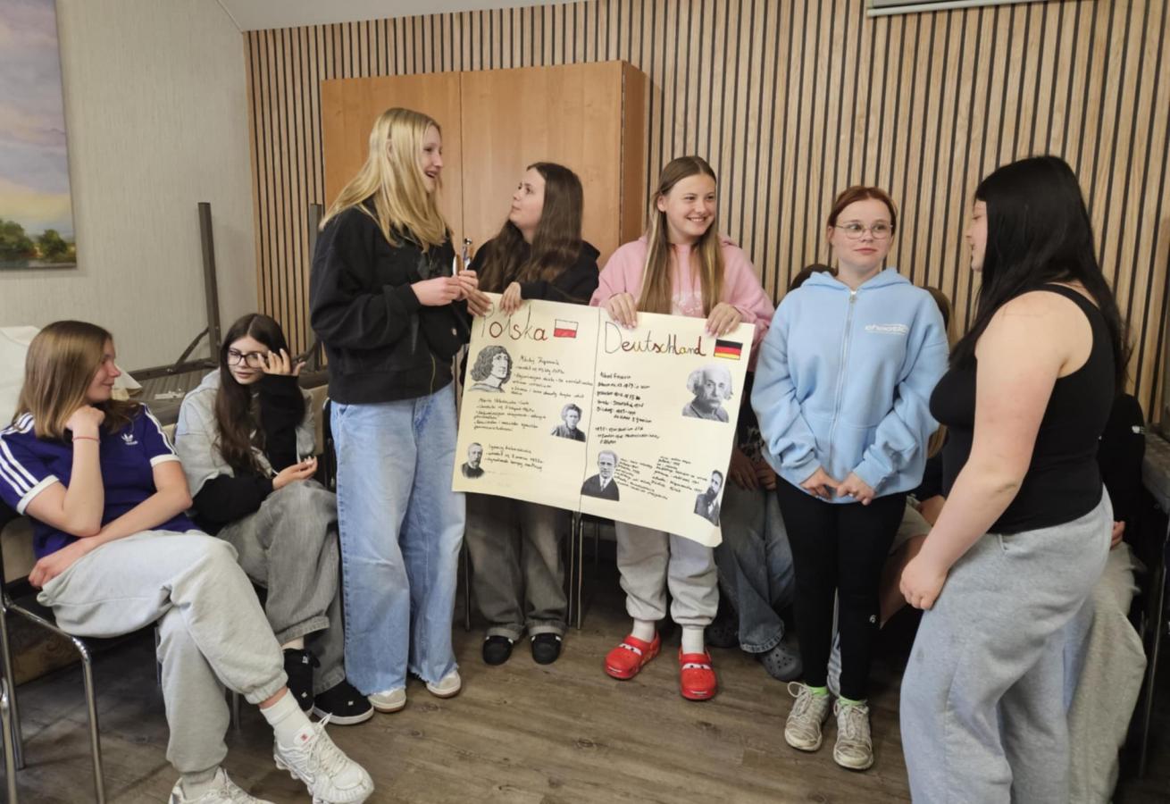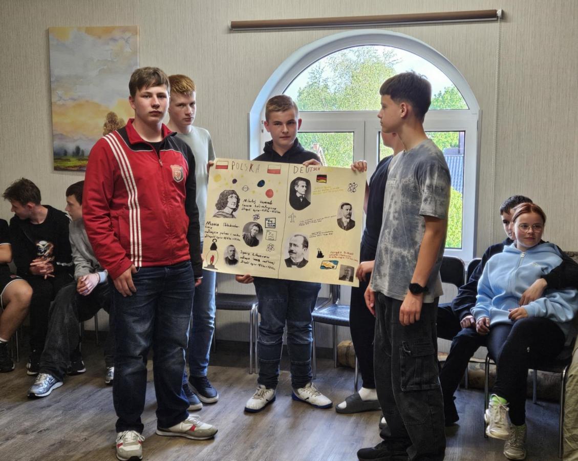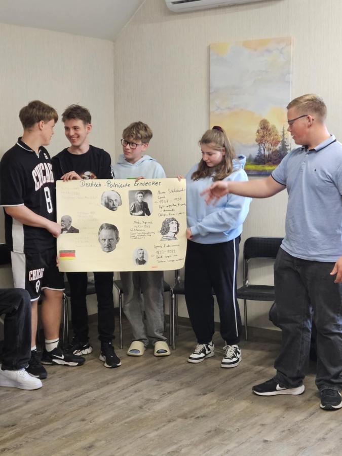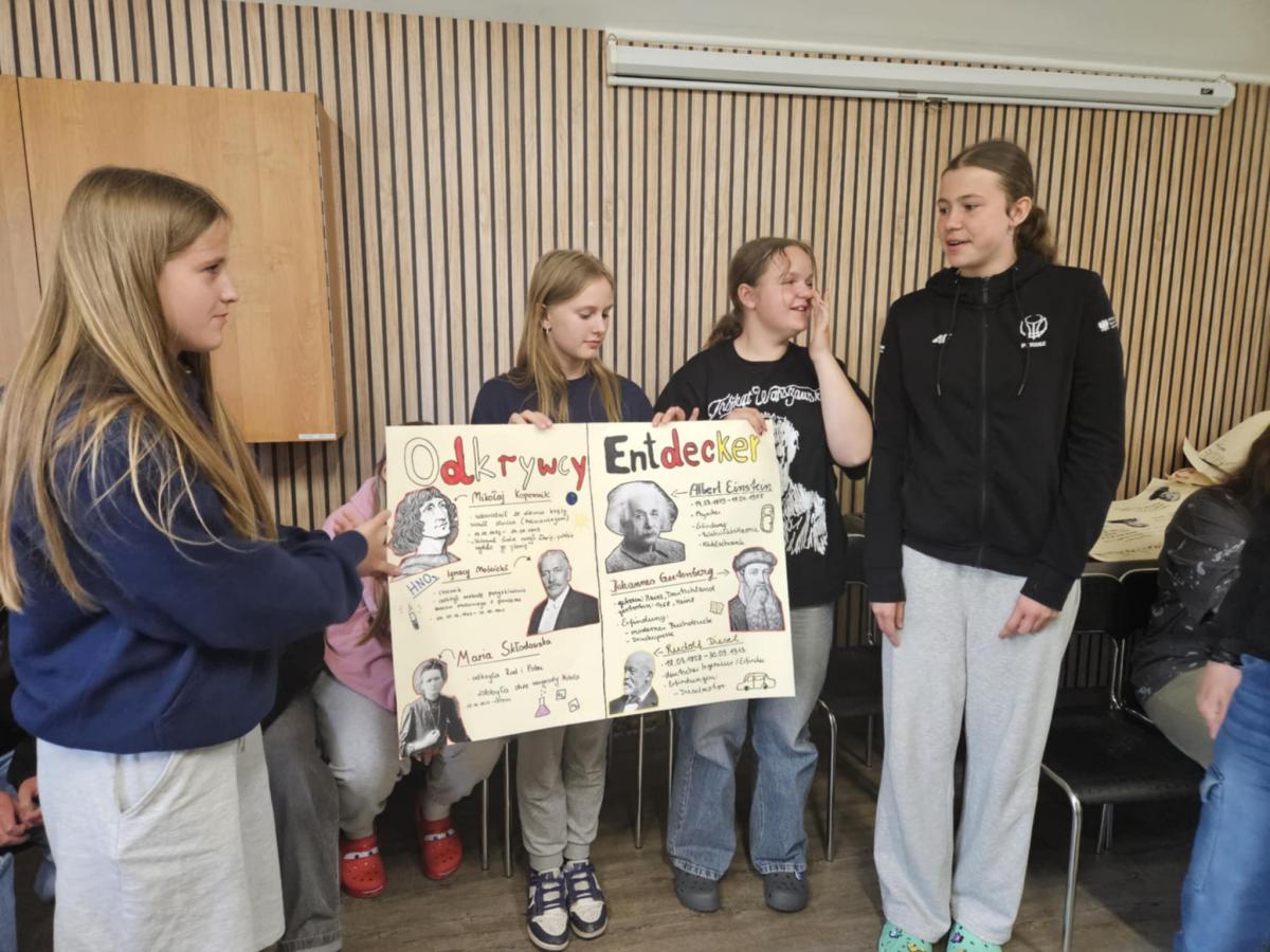 Nasi uczniowie pracowali w międzynarodowych, mieszanych grupach, biorąc udział w inspirujących warsztatach STEAM. Wspólnie budowali roboty LEGO z chwytakami do wyławiania śmieci z rzeki, projektowali innowacyjne koszyki filtracyjne, które po wydrukowaniu w technologii 3D będą służyły oczyszczaniu wody, a także tworzyli plakaty poświęcone polskim i niemieckim odkrywcom.