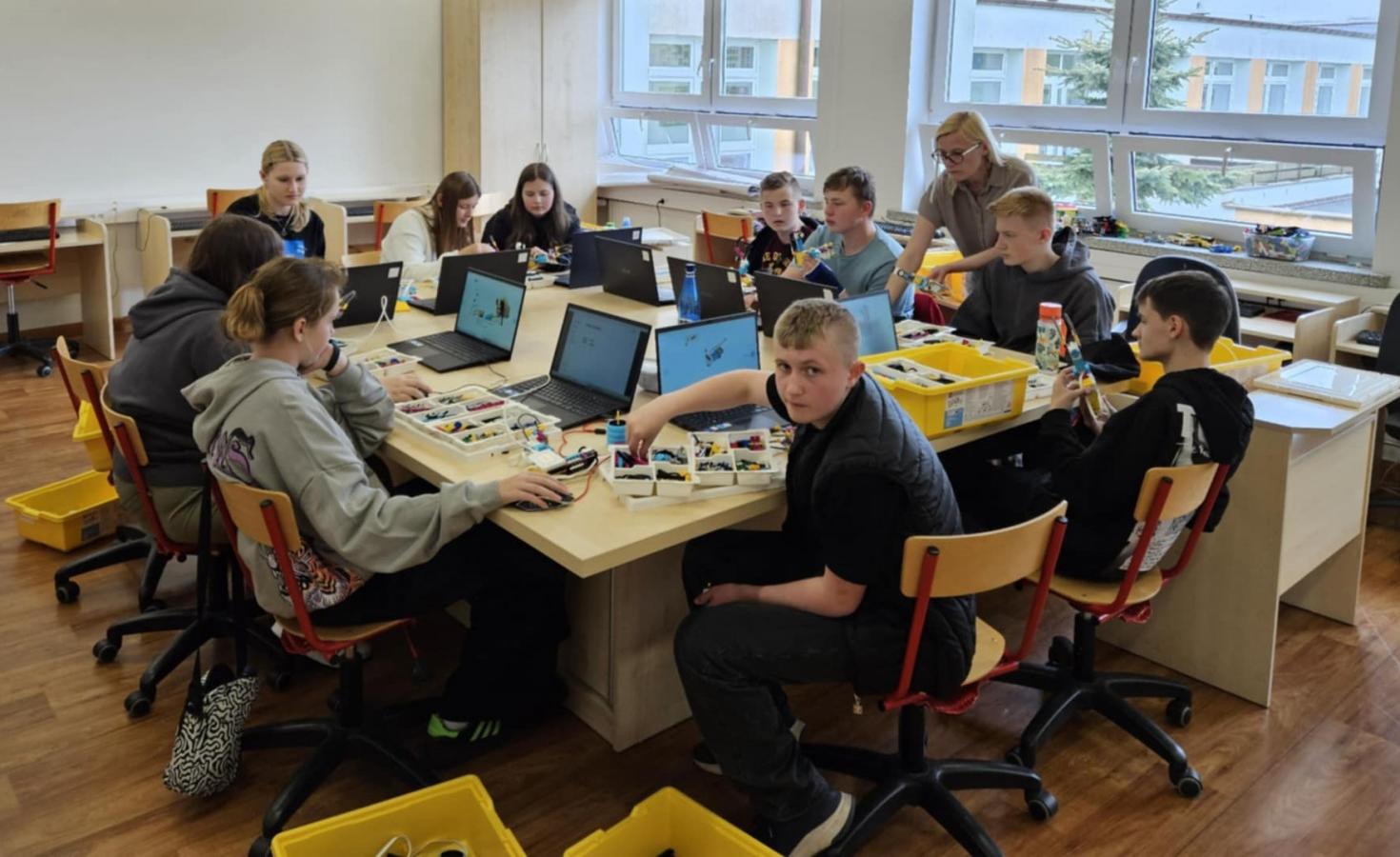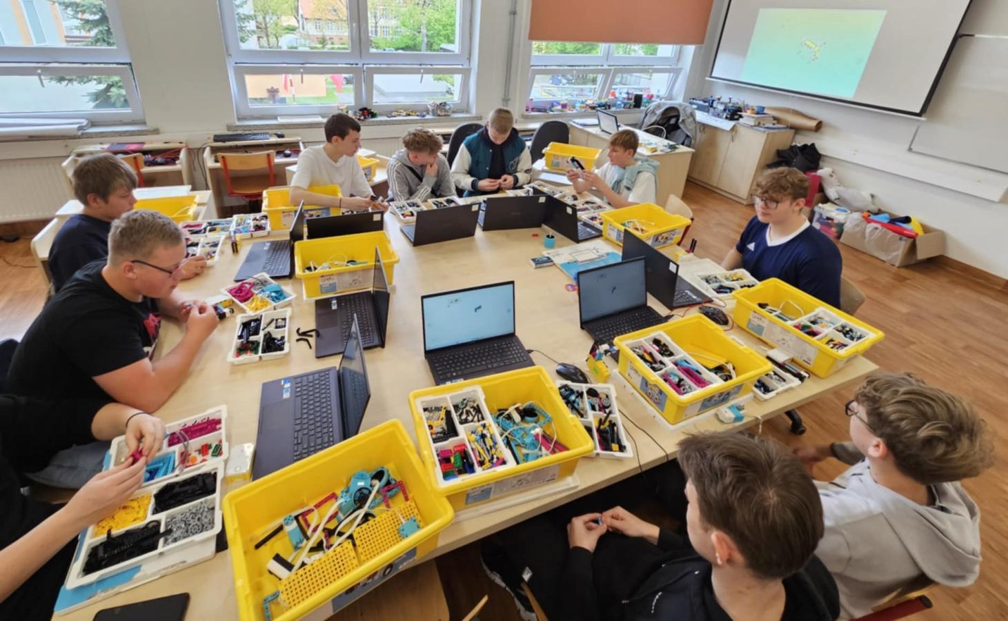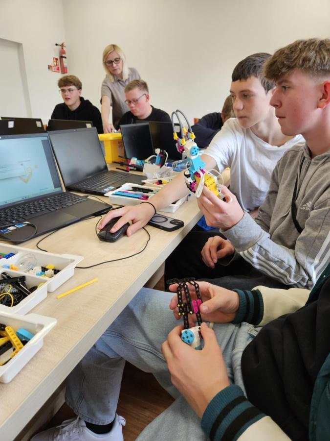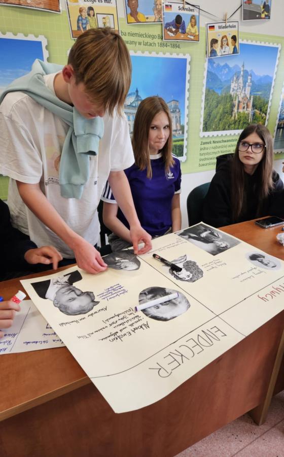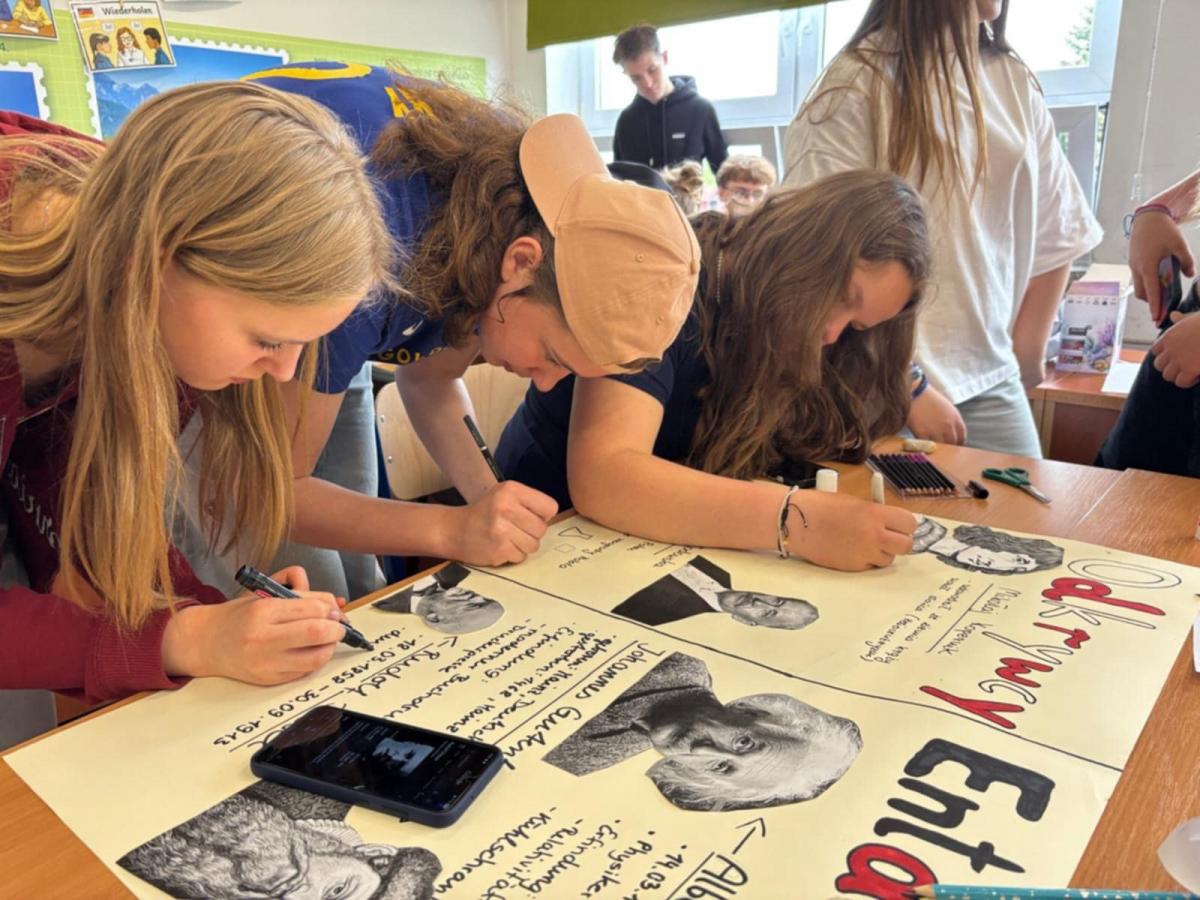 Nasi uczniowie pracowali w międzynarodowych, mieszanych grupach, biorąc udział w inspirujących warsztatach STEAM. Wspólnie budowali roboty LEGO z chwytakami do wyławiania śmieci z rzeki, projektowali innowacyjne koszyki filtracyjne, które po wydrukowaniu w technologii 3D będą służyły oczyszczaniu wody, a także tworzyli plakaty poświęcone polskim i niemieckim odkrywcom.