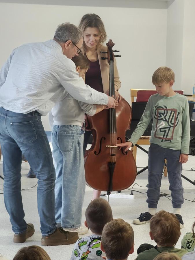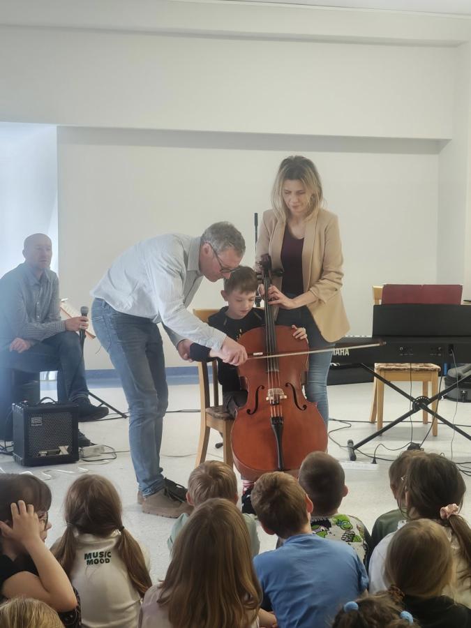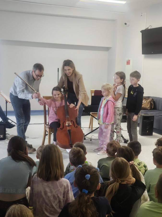 Pan Paweł Sadowski wraz ze swoją ekipą zabrał nas w niezwykły świat dźwięków. Dzieci miały okazję posłuchać muzyki klasycznej, poznając brzmienie kontrabasu i klarnetu oraz budowę tych instrumentów.