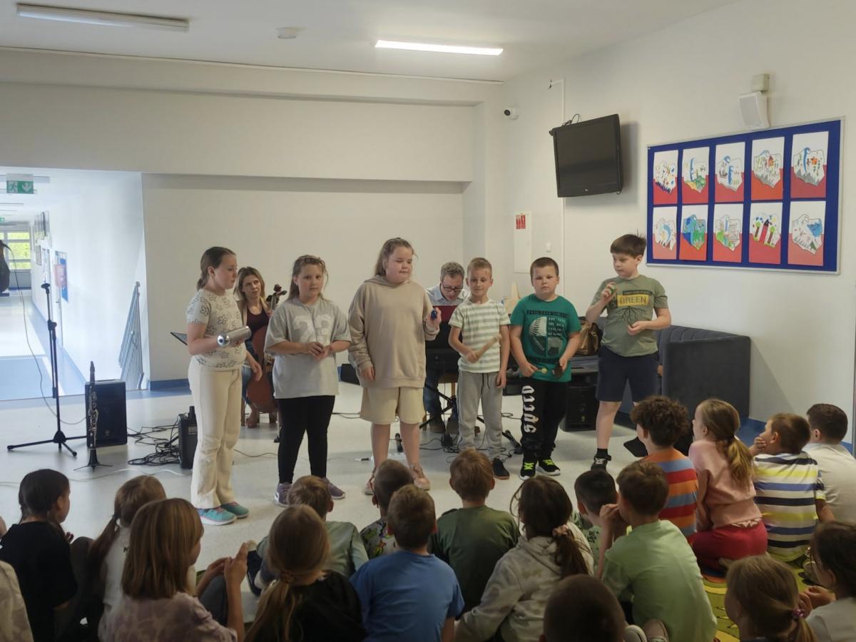 To nie wszystko! Mali artyści aktywnie uczestniczyli w tworzeniu muzyki — grali m.in. na deszczowni i innych ciekawych instrumentach perkusyjnych.