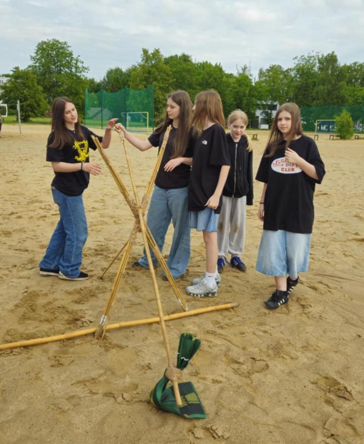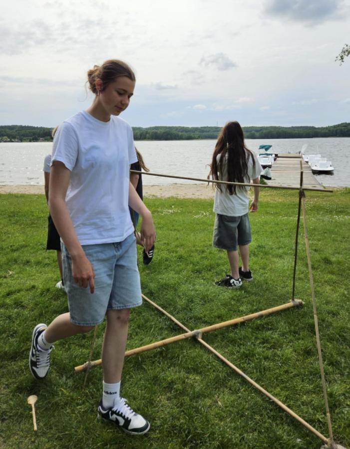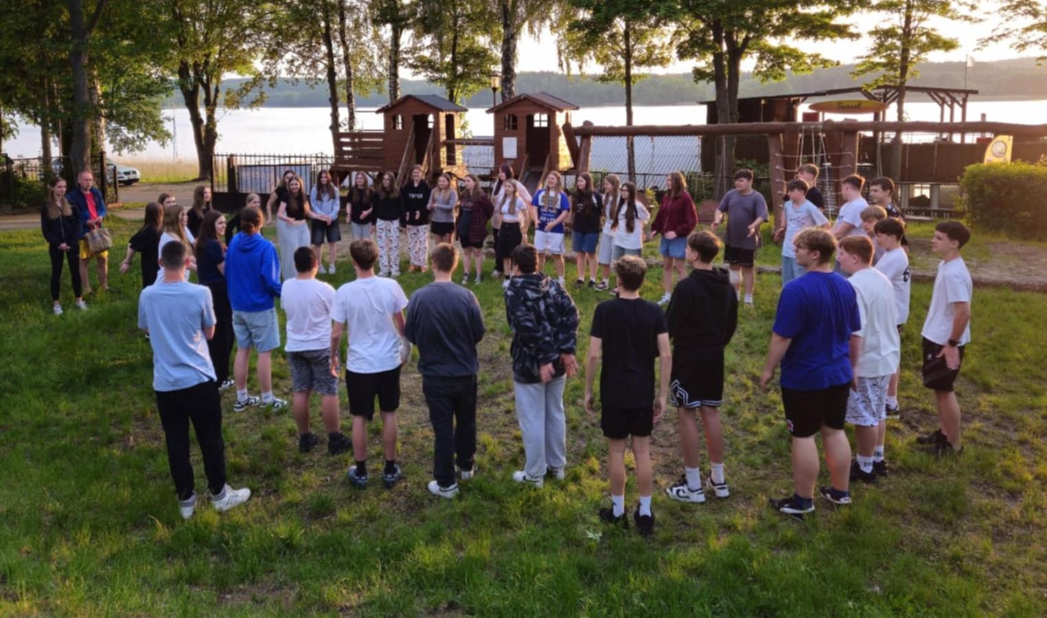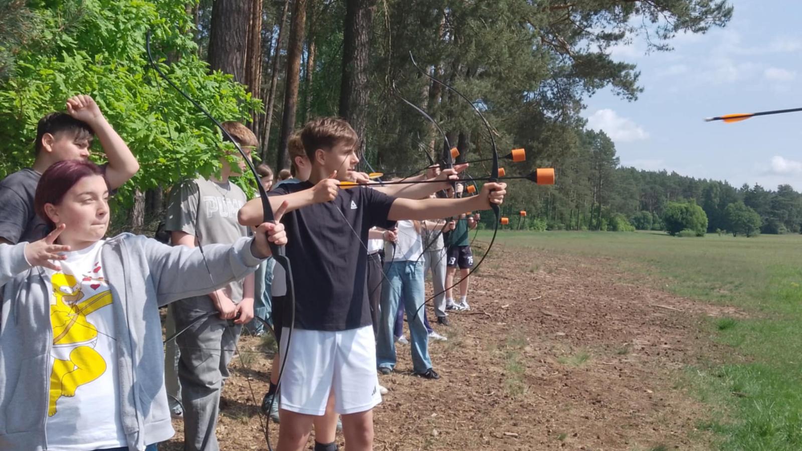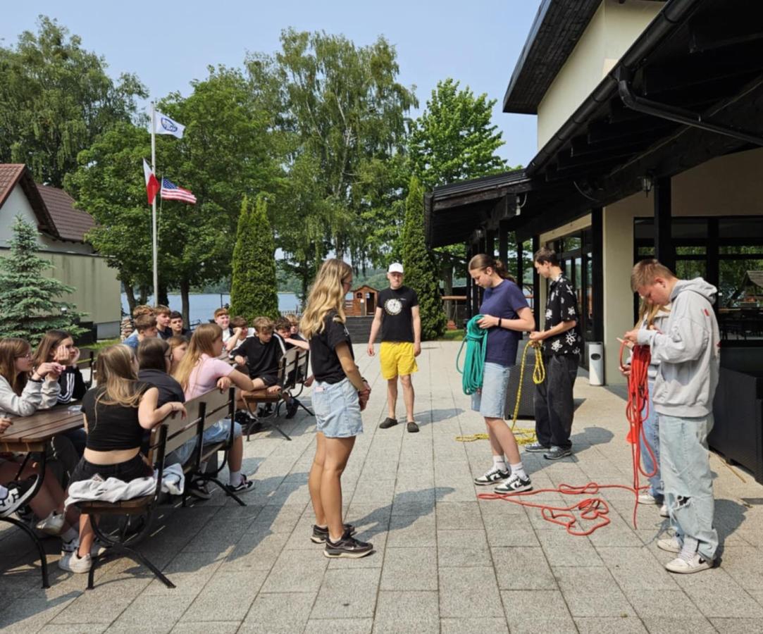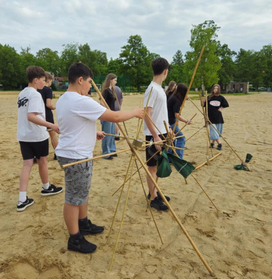 Nasi uczniowie mieli okazję spróbować swoich sił w pływaniu na pontonach, przejażdżkach rowerowych wzdłuż malowniczej linii brzegowej jeziora oraz w strzelaniu z łuku. Po intensywnym dniu pełnym wrażeń, wszyscy wspólnie zasiedliśmy przy ognisku, gdzie piekliśmy kiełbaski i dzieliliśmy się wrażeniami z dnia.