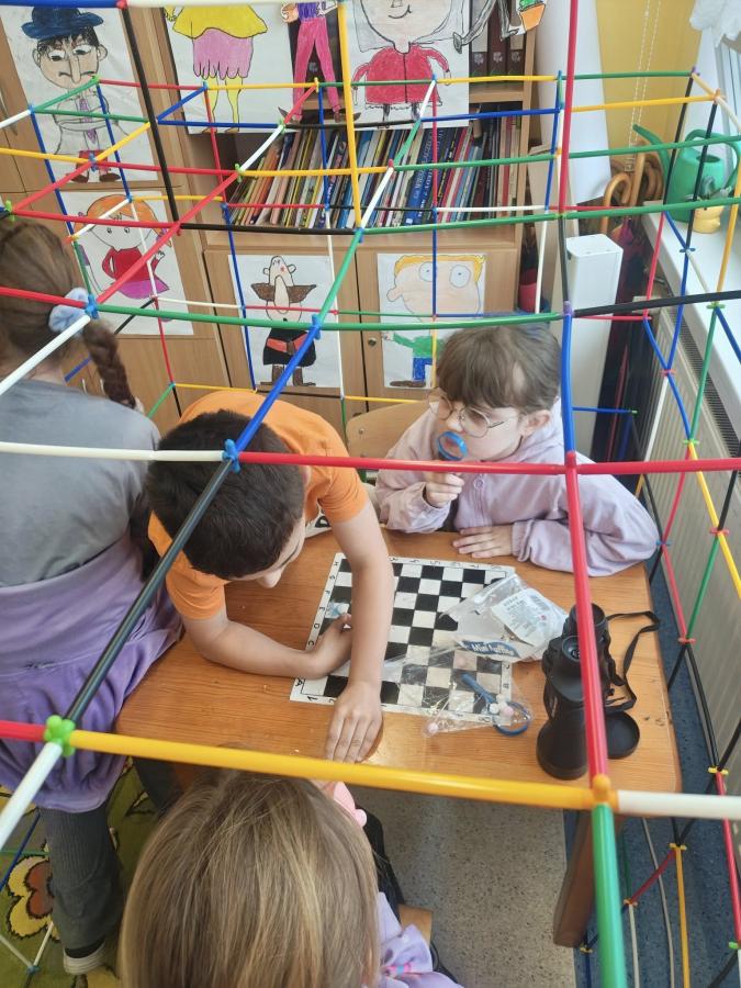 Na koniec dzieci utrwaliły części mowy, tropiąc cechy Pozytywki i Pana Martwiaka. Zabawa, nauka i śmiech – wszystko w jednym śledztwie!
