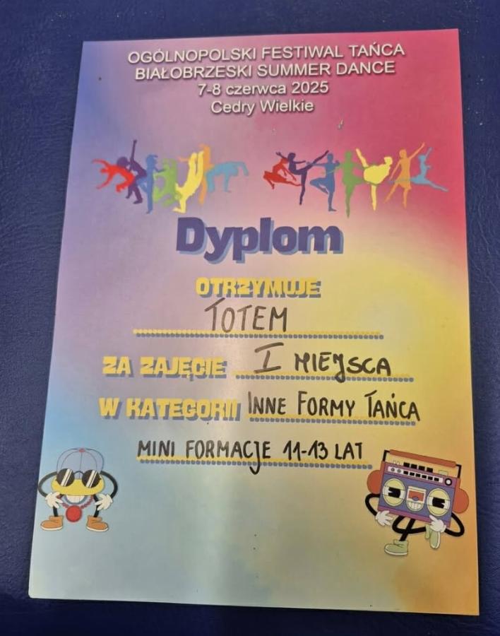 - Totem Dance Team- I miejsce- w Ogólnopolskim Festiwalu Tańca „Białobrzeski Summer Dance” w czerwcu 2025 r.,