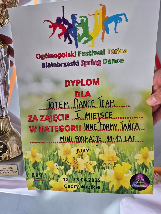 - Totem Dance Team- I miejsce w kategorii Inne Formy tańca podczas Ogólnopolskiego Festiwalu Tańca „Białobrzeski Spring Dance” w kwietniu 2025 r.,