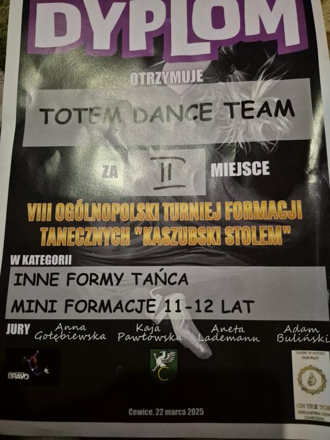 - Totem Dance Team- II miejsce- w VIII Ogólnopolskim Turnieju Formacji Tanecznych „Kaszubski Stolem” w marcu 2025 r.