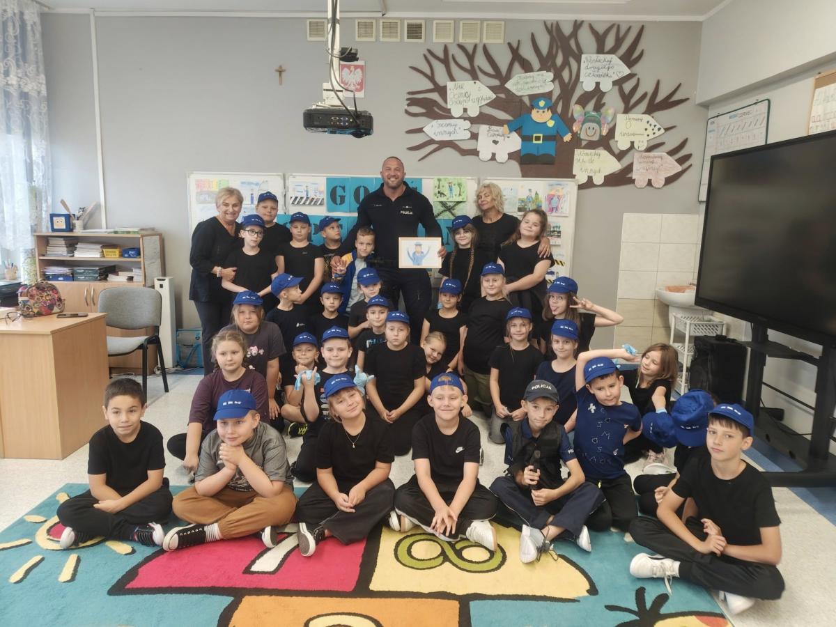 Klasy trzecie, w dowód wdzięczności, zaprosiły pana policjanta do wspólnego tańca.