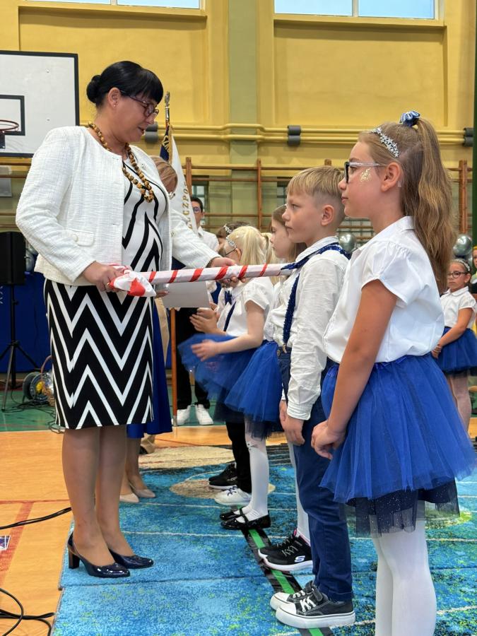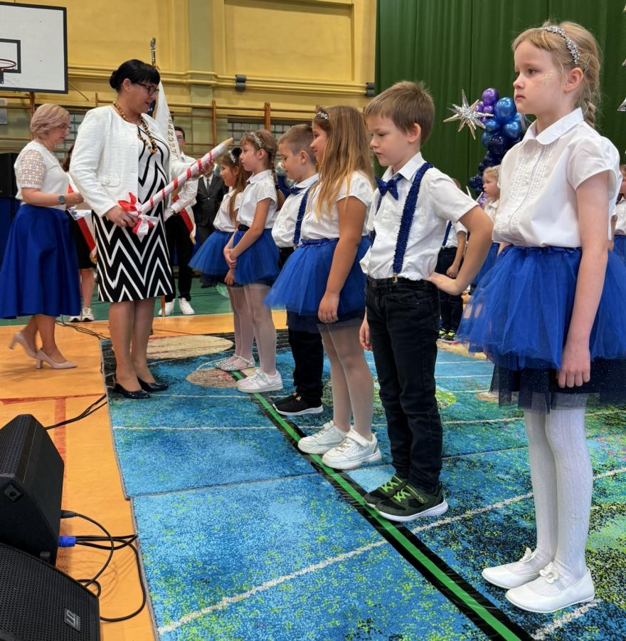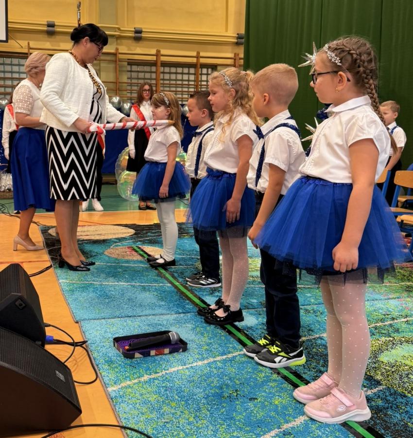 Najważniejszym momentem było złożenie ślubowania i symboliczne pasowanie na ucznia przez Panią Dyrektor, co oficjalnie wprowadziło uczniów do społeczności szkolnej.