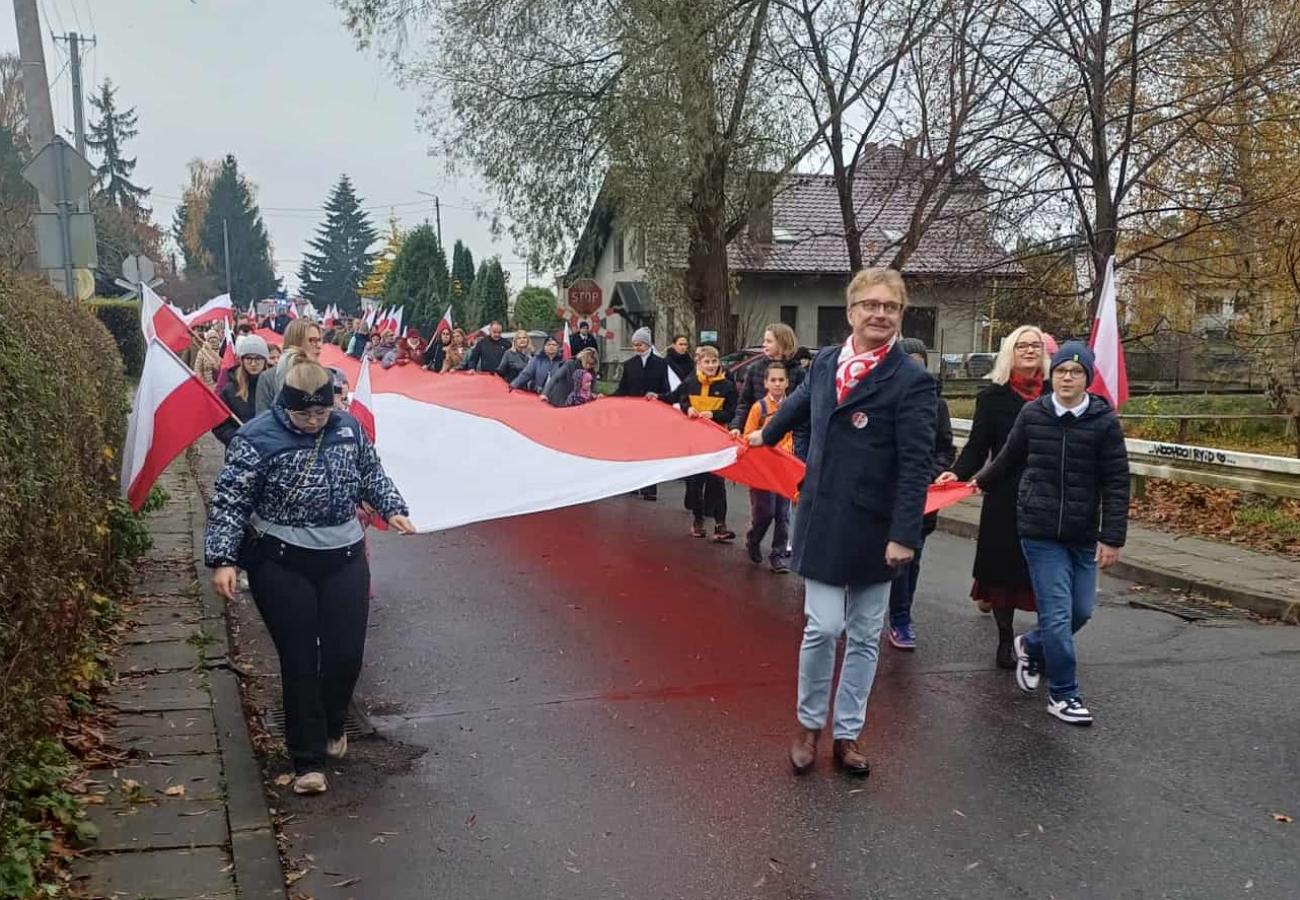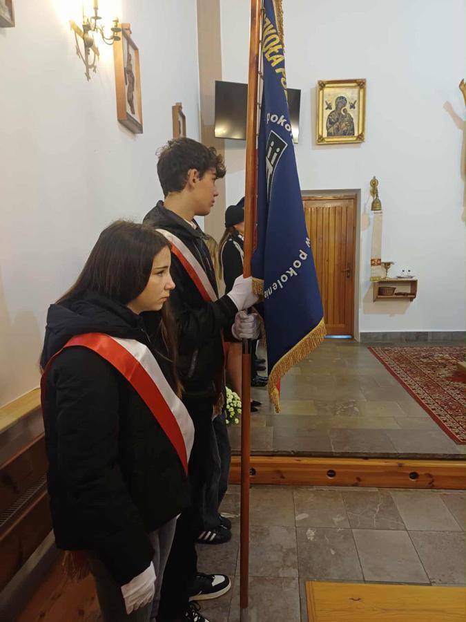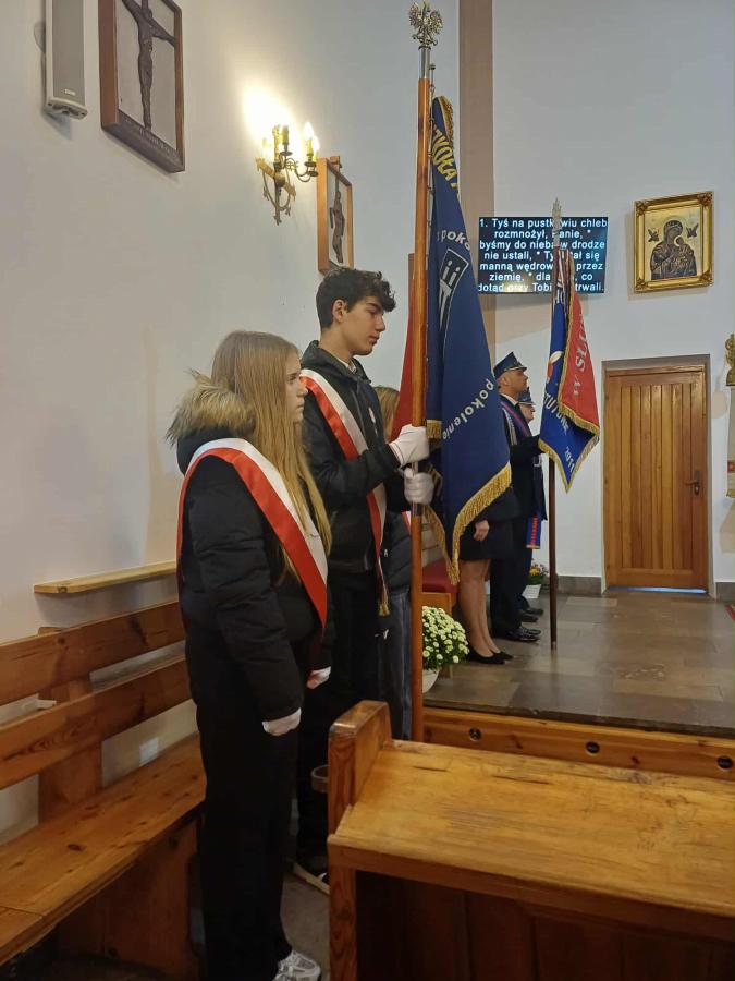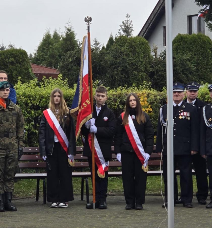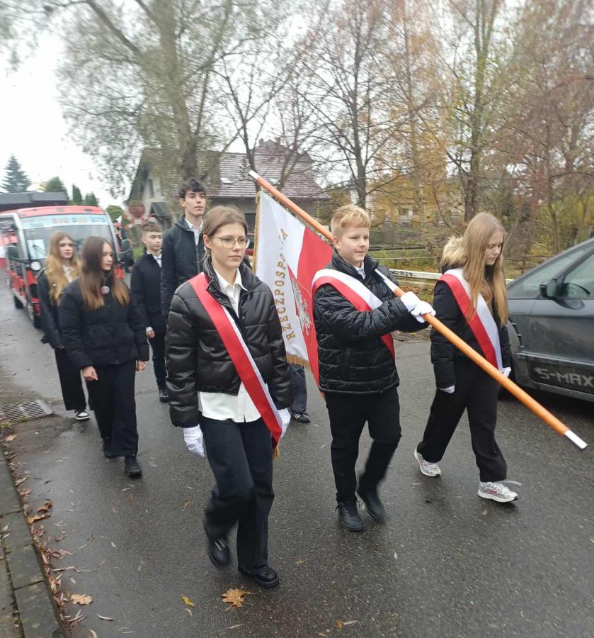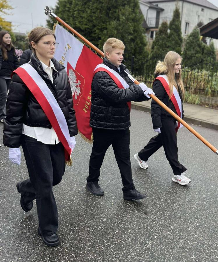 Poczet sztandarowy szkoły pięknie prezentował się podczas wszystkich wydarzeń obchodów, nasi uczniowie i pracownicy włączyli się w Marsz Niepodległości, lektorzy poprowadzili uroczystość patriotyczną, delegacja złożyła kwiaty.