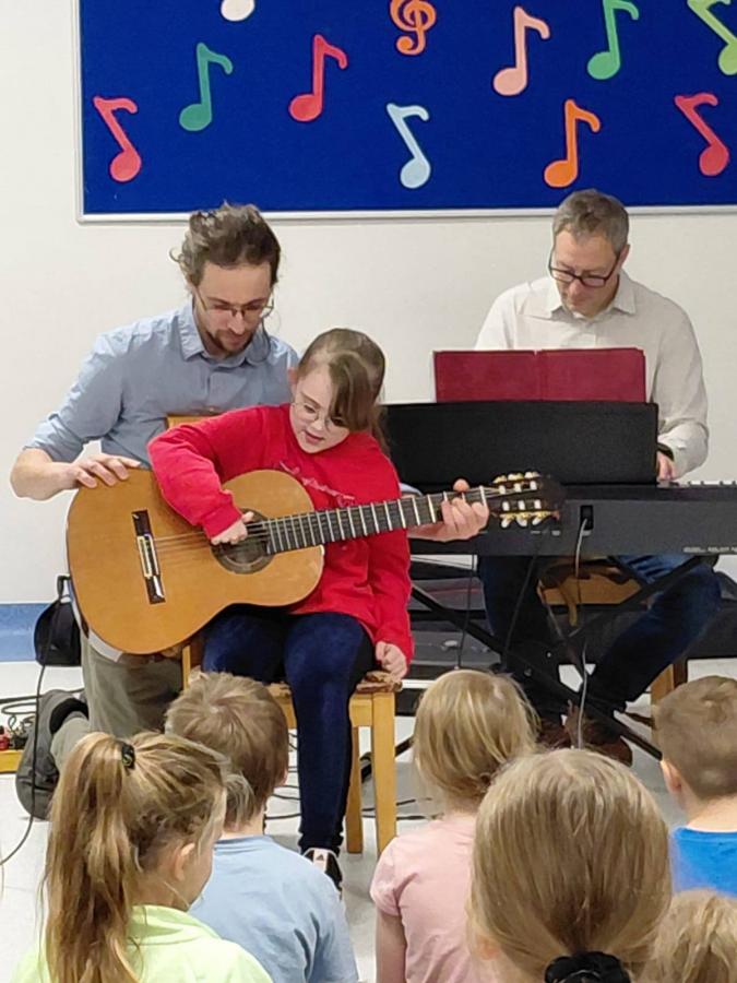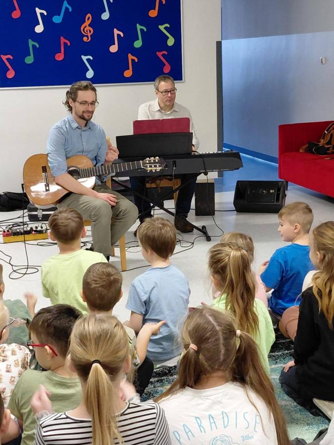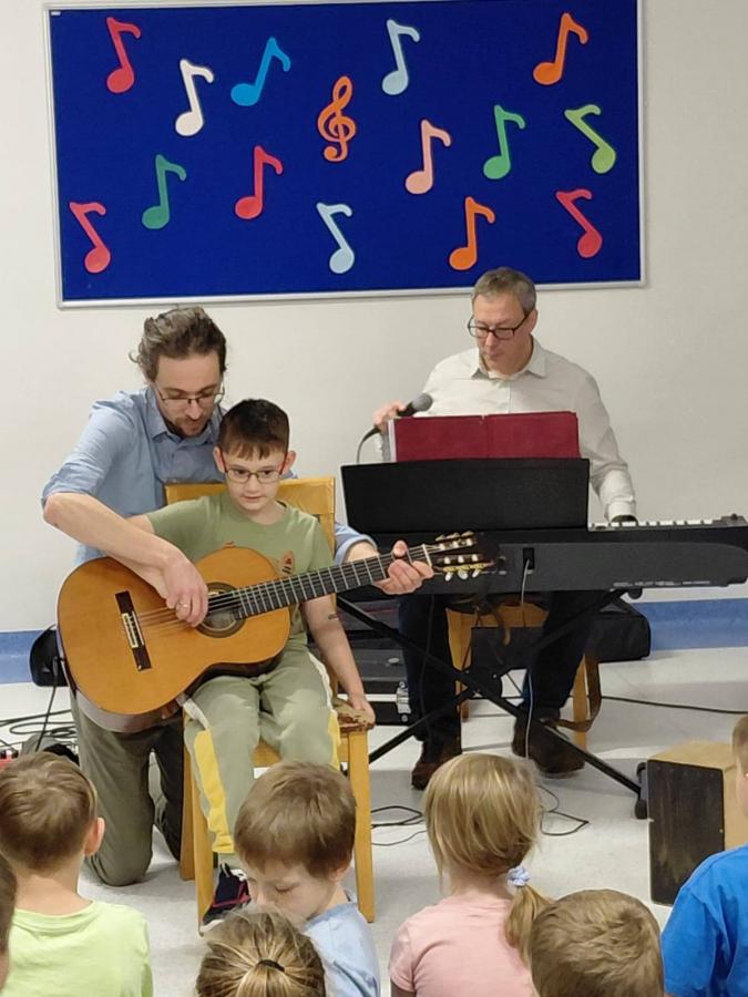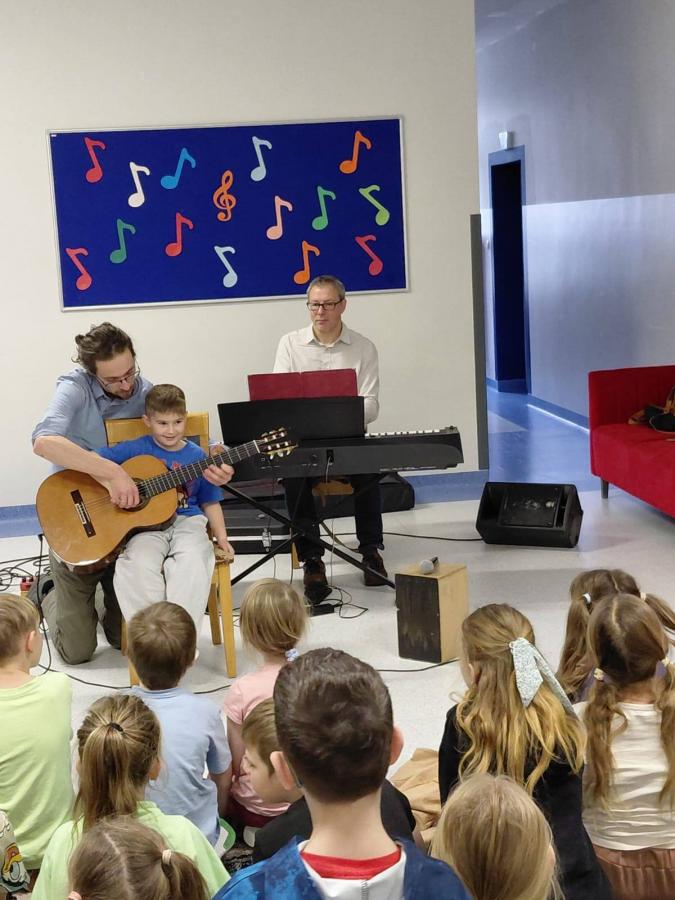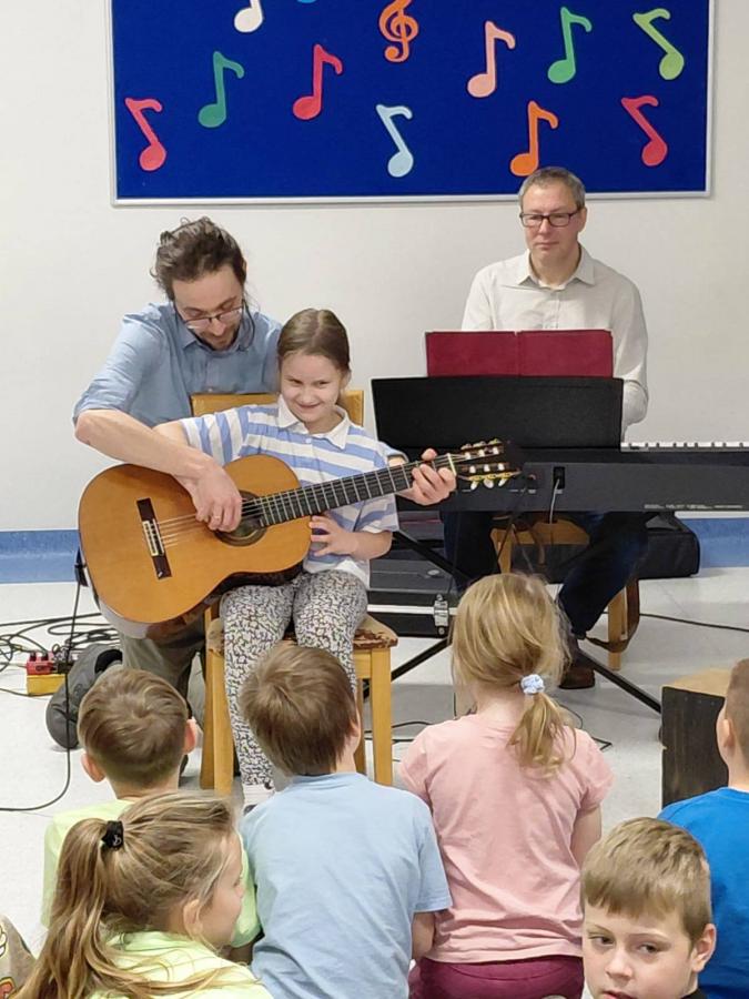 Goście zaprezentowali grę na gitarze klasycznej i elektrycznej, a także opowiedzieli uczniom o tych instrumentach w ciekawy i przystępny sposób.