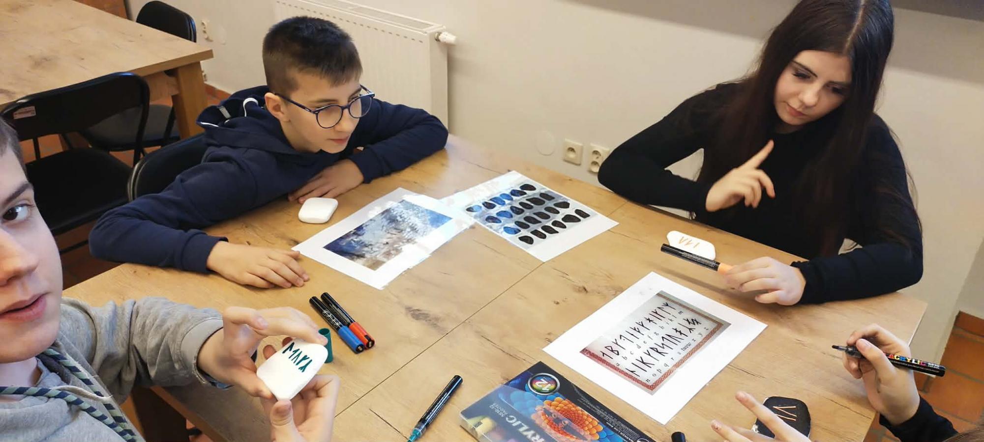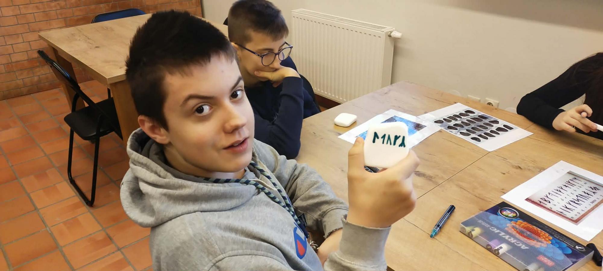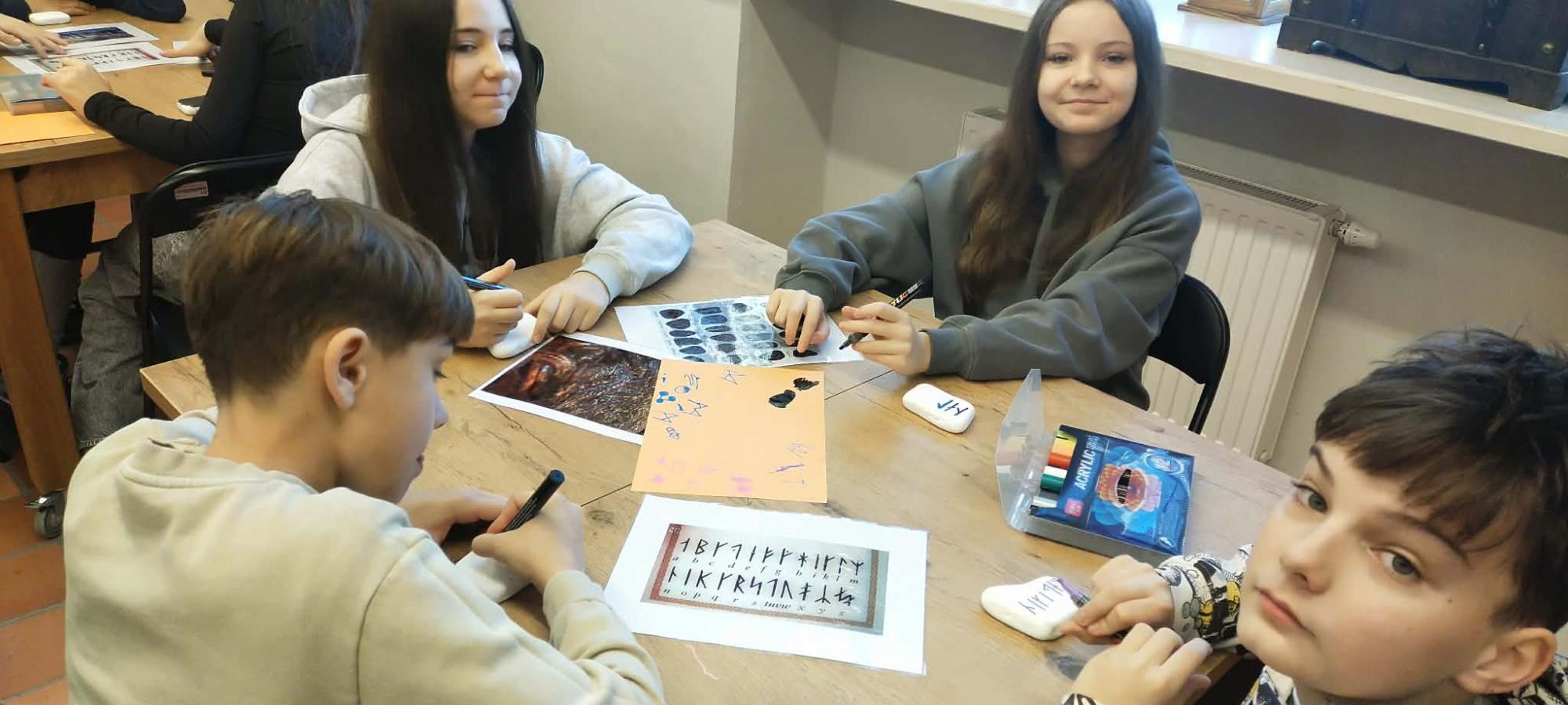 Oprócz tradycyjnego zwiedzania wystaw uczniowie wzięli udział w warsztatach, na których próbowali swoich sił w wykorzystaniu pisma runicznego.
