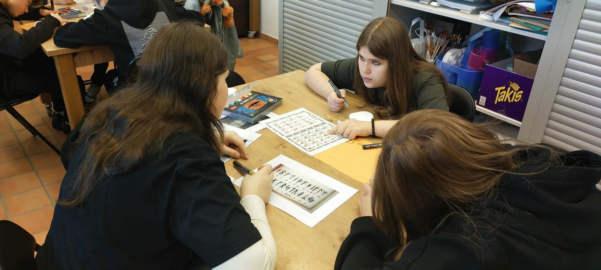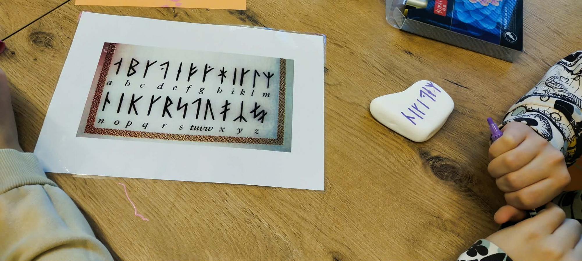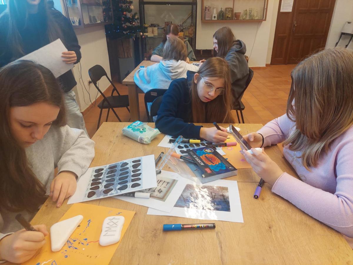 Oprócz tradycyjnego zwiedzania wystaw uczniowie wzięli udział w warsztatach, na których próbowali swoich sił w wykorzystaniu pisma runicznego.