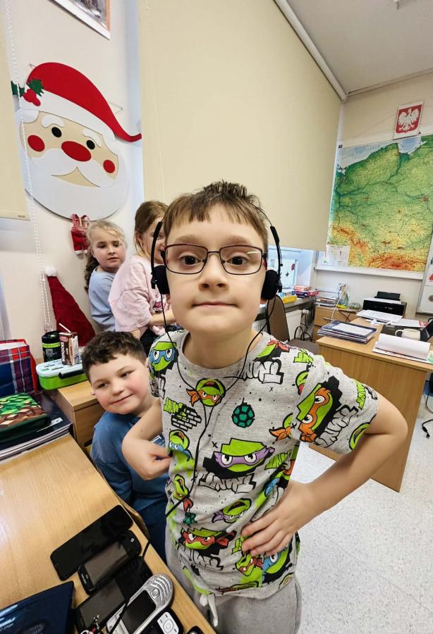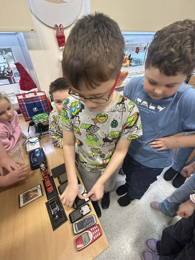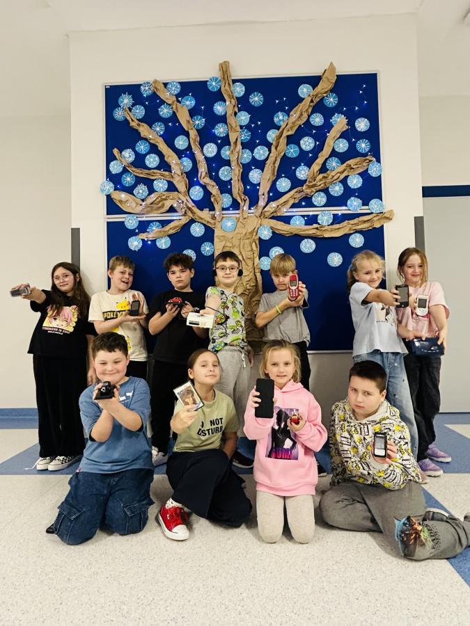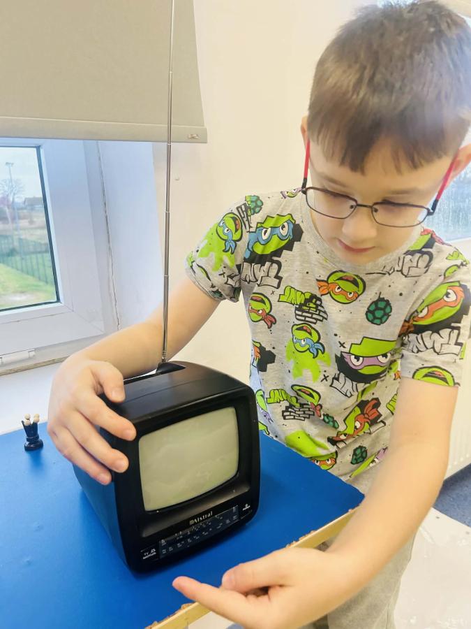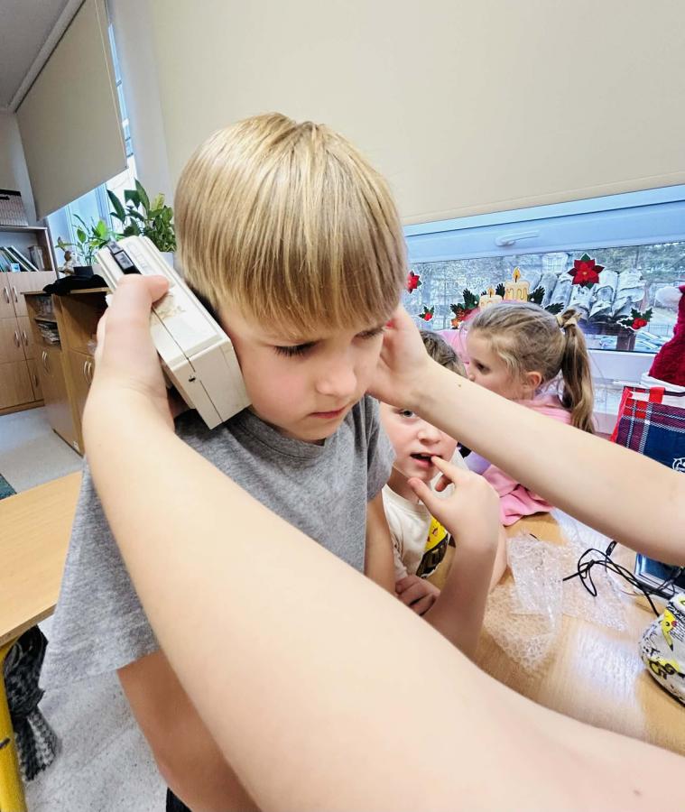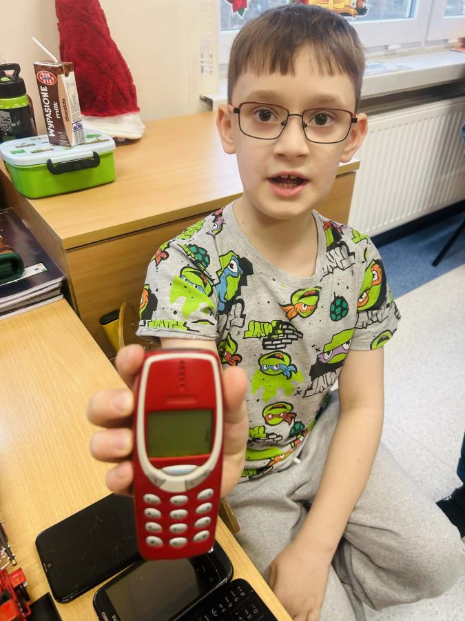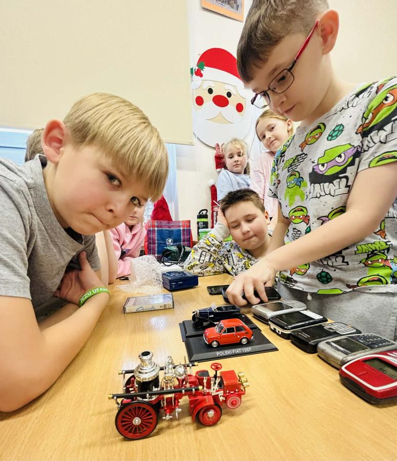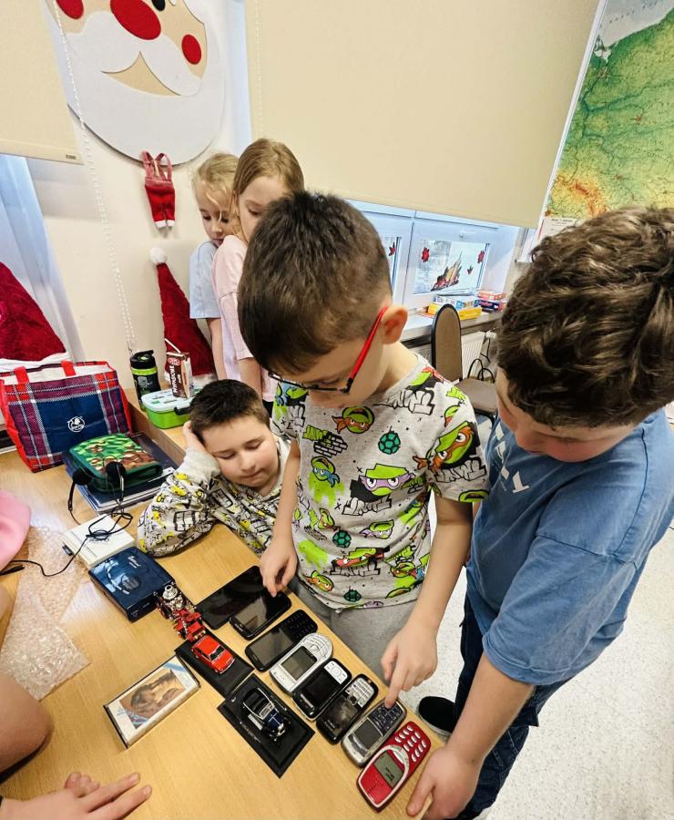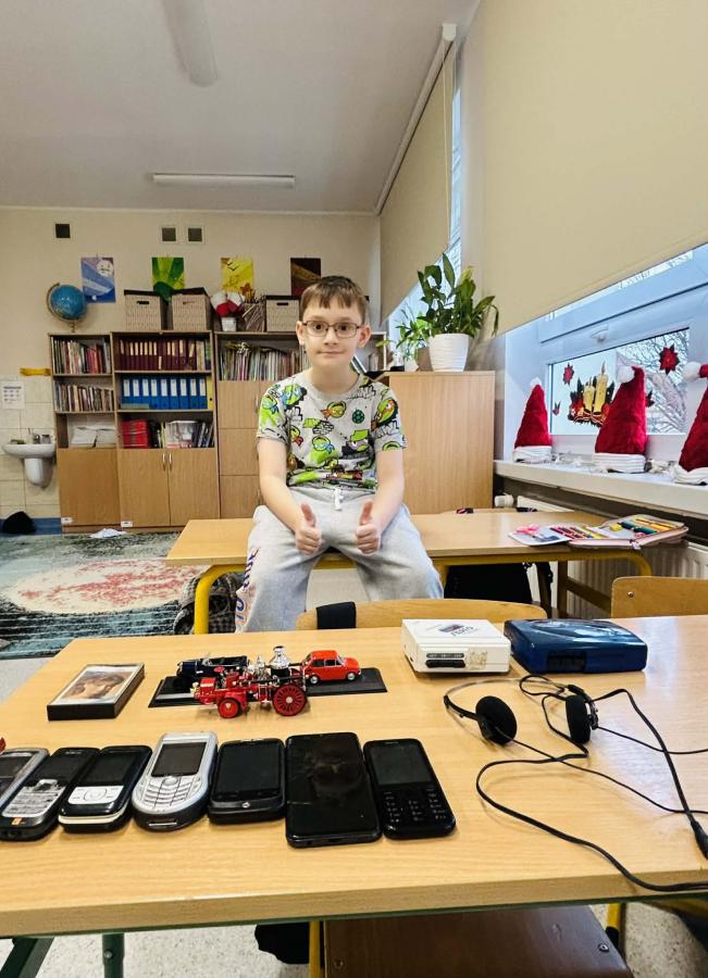 Uczeń zaprezentował koleżankom i kolegom kolekcję starych telefonów, pokazał jak działał walkman, zapoznał wszystkich z dawnymi słuchawkami i kasetami magnetofonowymi, a także zaprezentował modele starych samochodów.