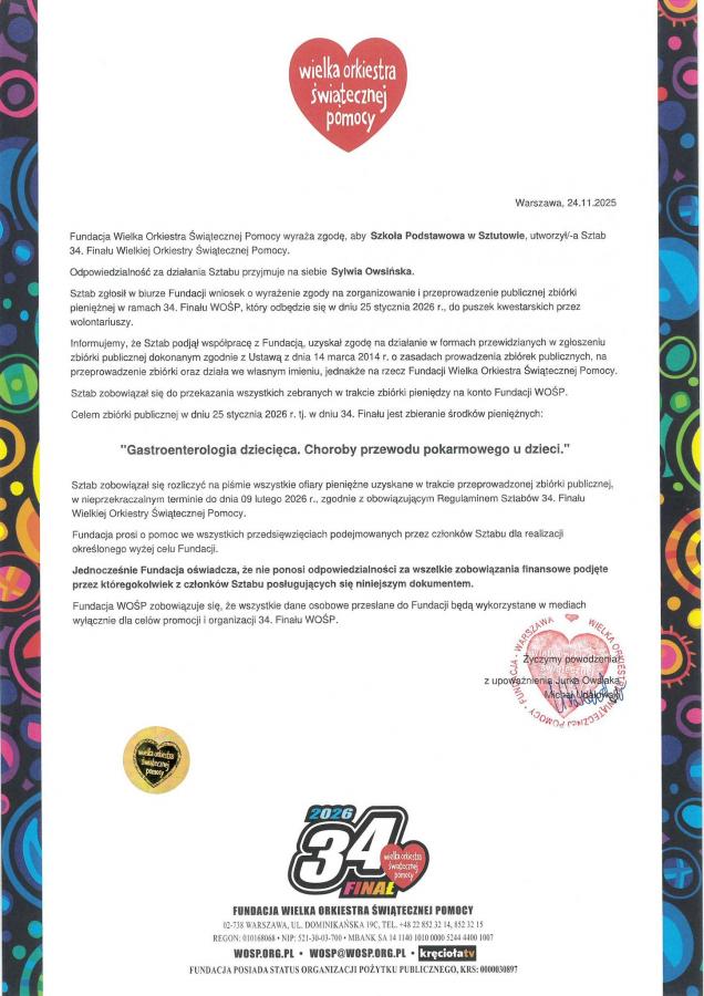 Informujemy, iż kolejny raz w naszej szkole utworzony został sztab 34. Finału WOŚP.