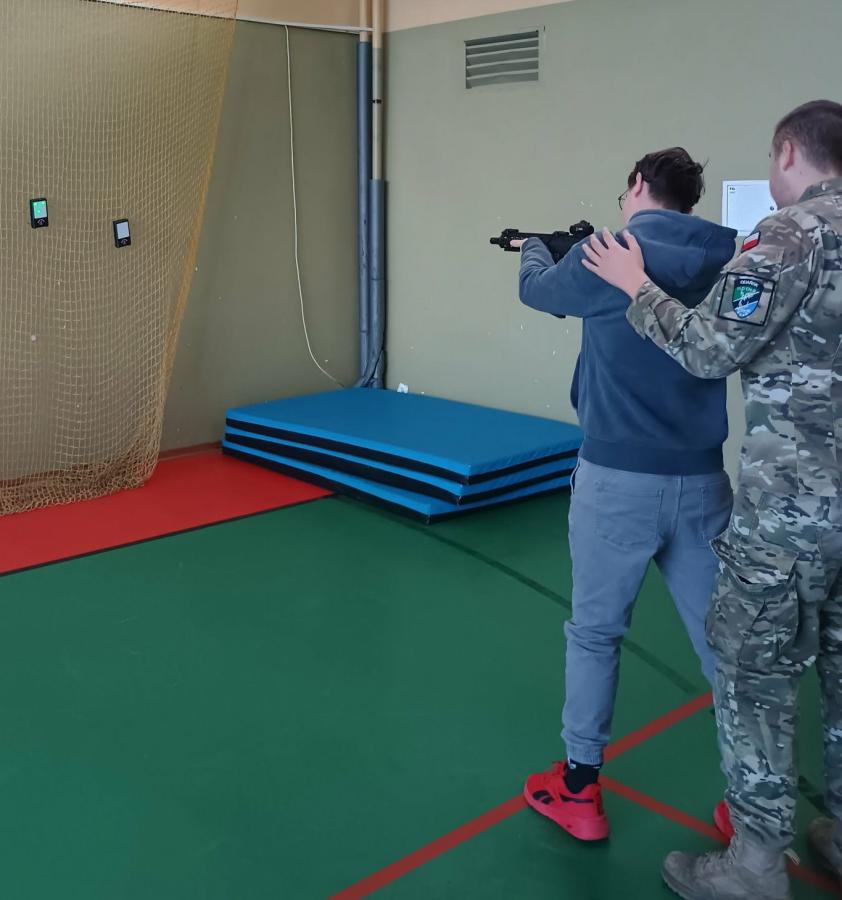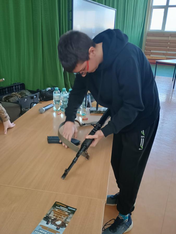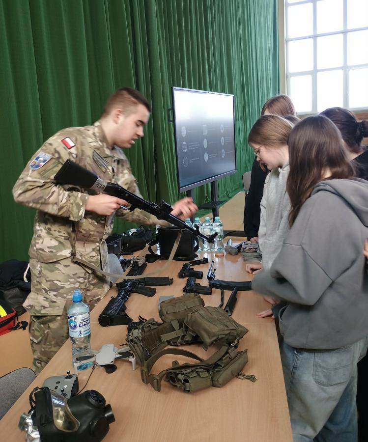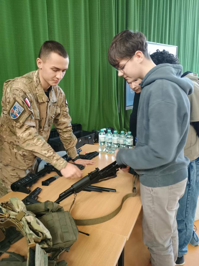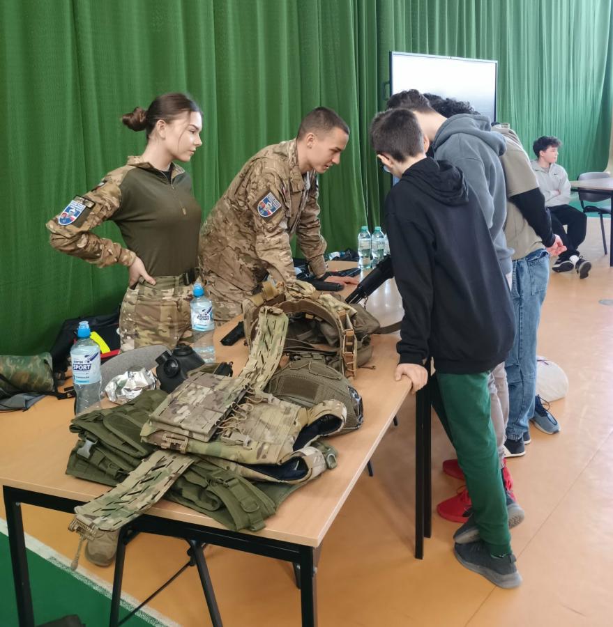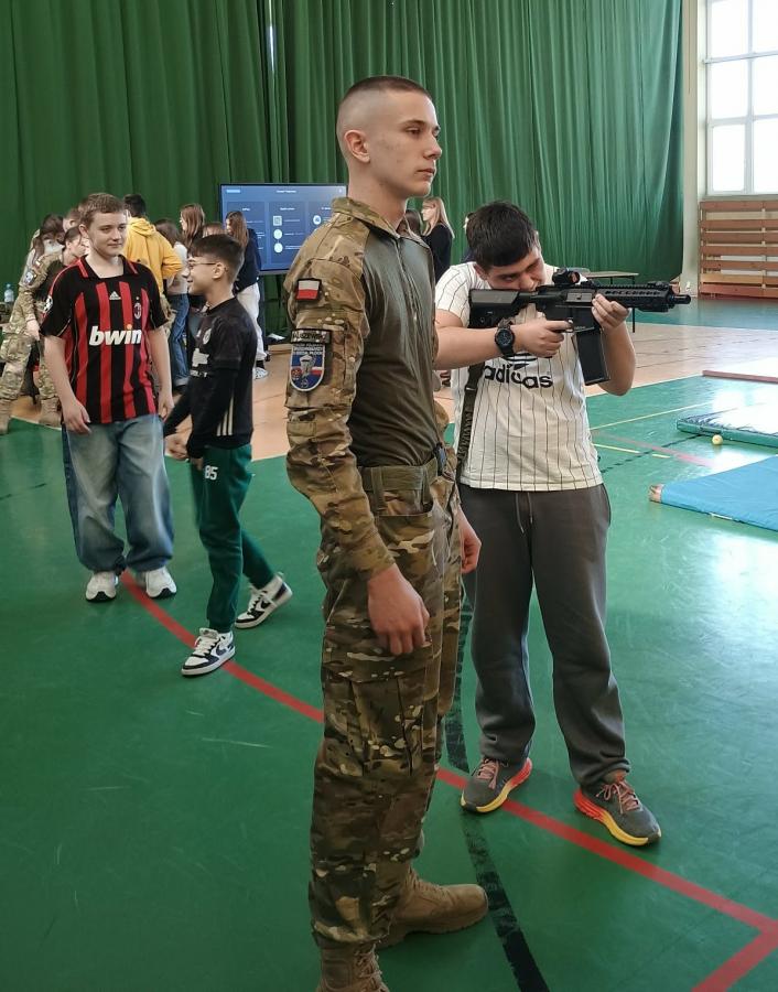 Uczniowie mieli możliwość przymierzenia kamizelek taktycznych, zobaczenia sprzętu szkoleniowego, a także spróbowania rozkładania broni i strzelania do tarcz treningowych.