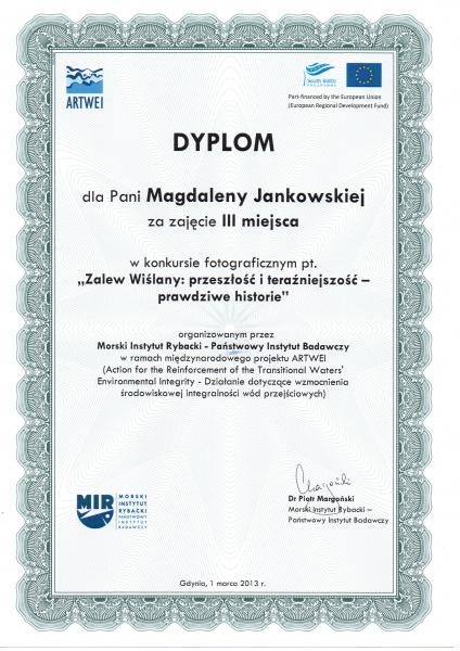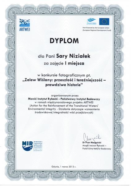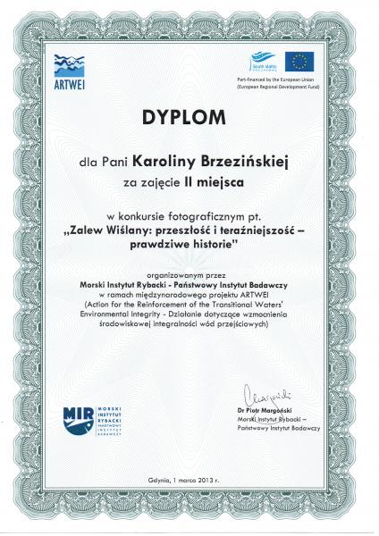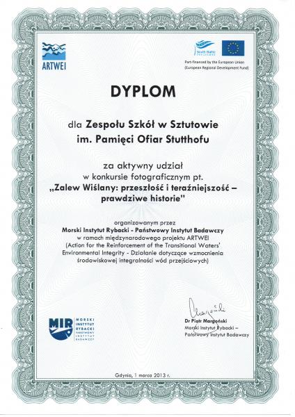 Morski Instytut Rybacki w Gdyni realizował projekty ARTWEI mający na celu wzmocnienie środowiskowej integralności wód przejściowych. Odniósł się on do czterech transgenicznych regionów na obszarze Bałtyku Południowego: Zalewu Kurońskiego, Zalewu Wiślanego, Zalewu Szczecińskiego oraz Cieśniny Dresund. W ramach projektu ogłoszono konkurs fotograficzny pod hasłem ,,Zalew Wiślany- przeszłość i teraźniejszość”, w którym to wzięła udział nasza szkoła. Placówkę do konkursu zgłosiła pani Bożena Nowak, ona też czuwała nad jego przebiegiem. 1 marca 2013 roku pojechałyśmy do Gdyni, gdzie w Akwarium Gdyńskim odebrałyśmy nagrody.