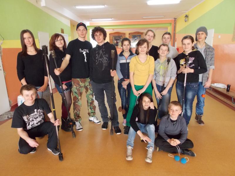 W miniony weekend w szkole odbyły się warsztaty kuglarskie. Wzięli w nich udział uczestnicy projektu Teatr Elektroluminescencji Stowarzyszenia Szkona 13. Zajęcia prowadzili członkowie grupy FireSzał z Tczewa. Atmosfera była naprawdę wyśmienita tym bardziej, że obydwie grupy świetnie ze sobą współpracowały. Pod okiem profesjonalistów młodzież uczyła się posługiwania poi i kijami.